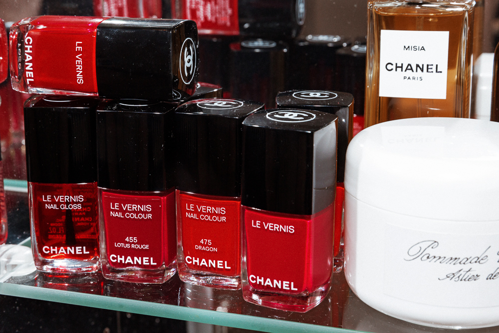 My feet don't look very nice now [Laughs] but I love a pedicure. I go to a place next to the office called Institut Carlota, on Avenue Hoche. A lot of people go, mostly older women, but it's really good. And kind of old-fashioned. I only use Chanel Le Vernis—I love Dragon. It's like the lips! I love to put red lips on girls, but I only put red on my feet.