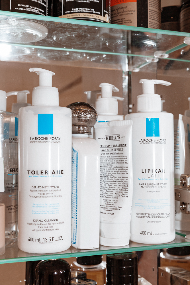 La Roche-Posay Toleriane Dermo-Cleanser is my face wash. It's a really deep clean for my sensitive skin. That's what I've been using for the past 20 years, so it works, I guess. I hope! I like the Lipikar Lait every day, too—for body lotion, moisturizer, everything. My skin is very dry but I really like that. It's funny because I see La Roche-Posay in America at fancy dermatologist offices, and it's like, 'Really?!' We get it at the pharmacy for 20 euro. That's funny, no?