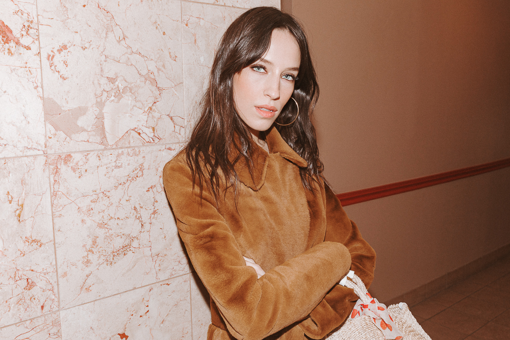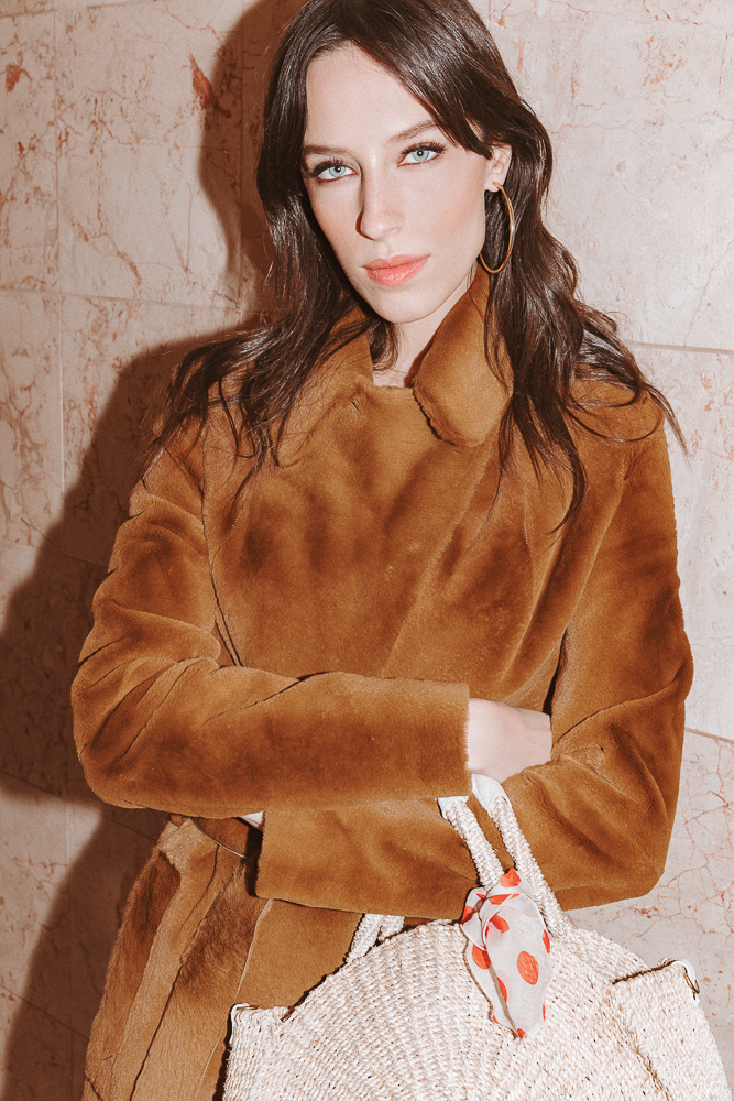 Alix wears an ALC coat, Clare V. bag, and Jennifer Fisher earrings.