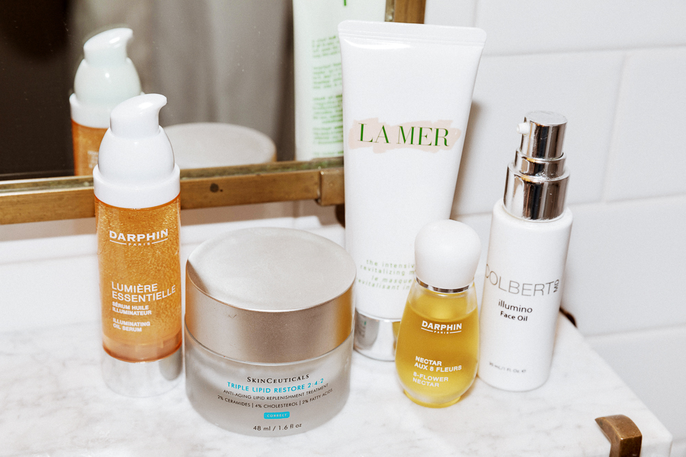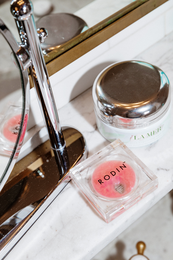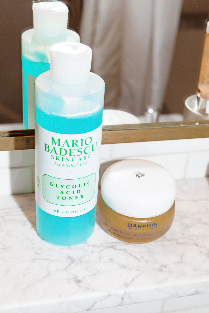 I’m very particular with my cleanser… Right now it’s this Darphin Rosewood, it’s heaven. I’m very particular with my cleanser and it changes for the season but during the winter time I prefer a balm, because my skin gets so dry. If I use anything that has even a sulfate or anything my skin feels like it’s going to peel off. Then, I’m going to contradict myself, because I’ve got the Mario Badescu Glycolic Toner—it’s amazing though. If I feel like I’m getting any sort of breakout, I’ll put that on. For me, that’s once a week.