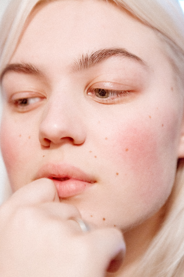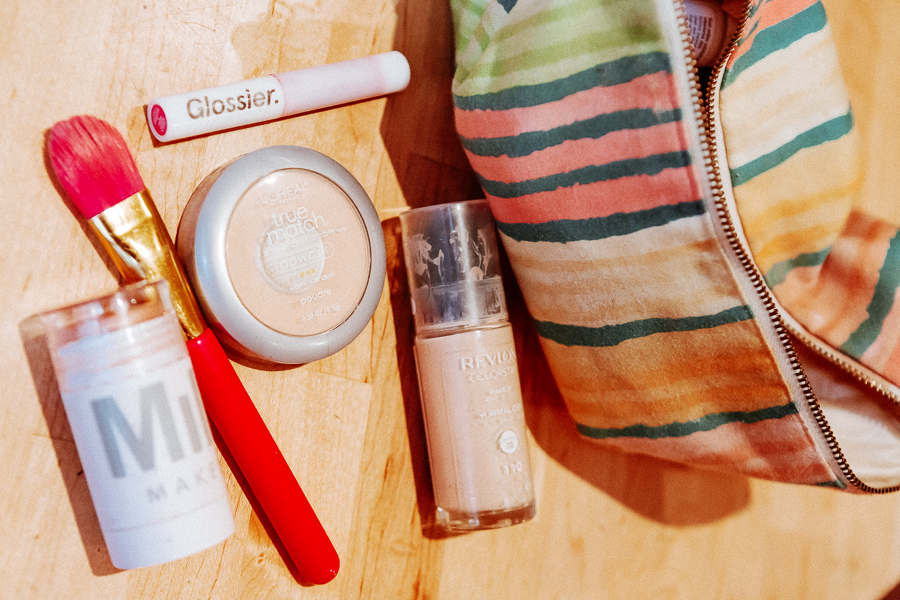 This is very embarrassing, but my foundation is Revlon Colorstay in the lightest shade it comes in, and I've never used anything else. It's really good at concealing pores and imperfections. Then I use another drugstore thing, L’Oréal True Match Powder in Porcelain, a bit over my foundation. But I only use foundation on my jawline and nose. I like showing my cheeks. People think I pack on the blush, but I don't!