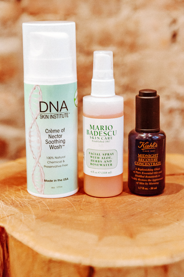 "I brought all my stuff with me for you guys. My skincare routine is very specific—I think it's fairly sensitive, but I can't go to bed without washing my face. I use this DNA Skin Institute Crème Of Nectar Soothing Wash, and this sounds weird, but it's made of juiced orchids. I found it from this spa in New Mexico. It's super milky... it almost feels like a treatment. I take my makeup off with Aveeno wipes, and then I use the Kiehl's Midnight Recovery Concentrate at night. It's supposed to be rejuventating, and it just makes my skin super soft.