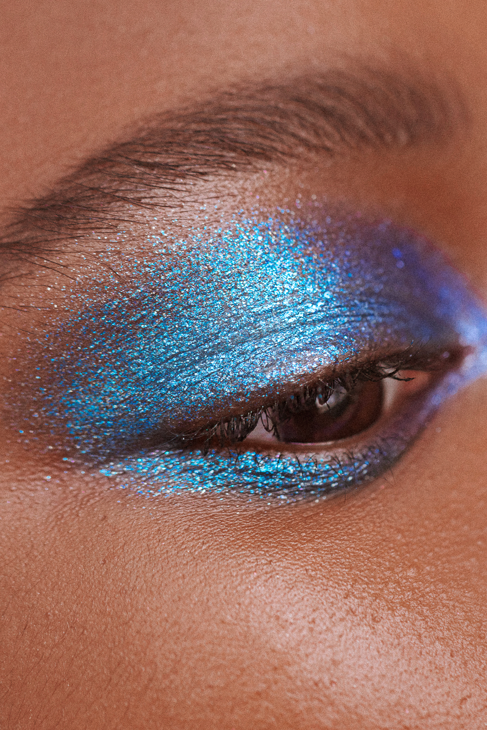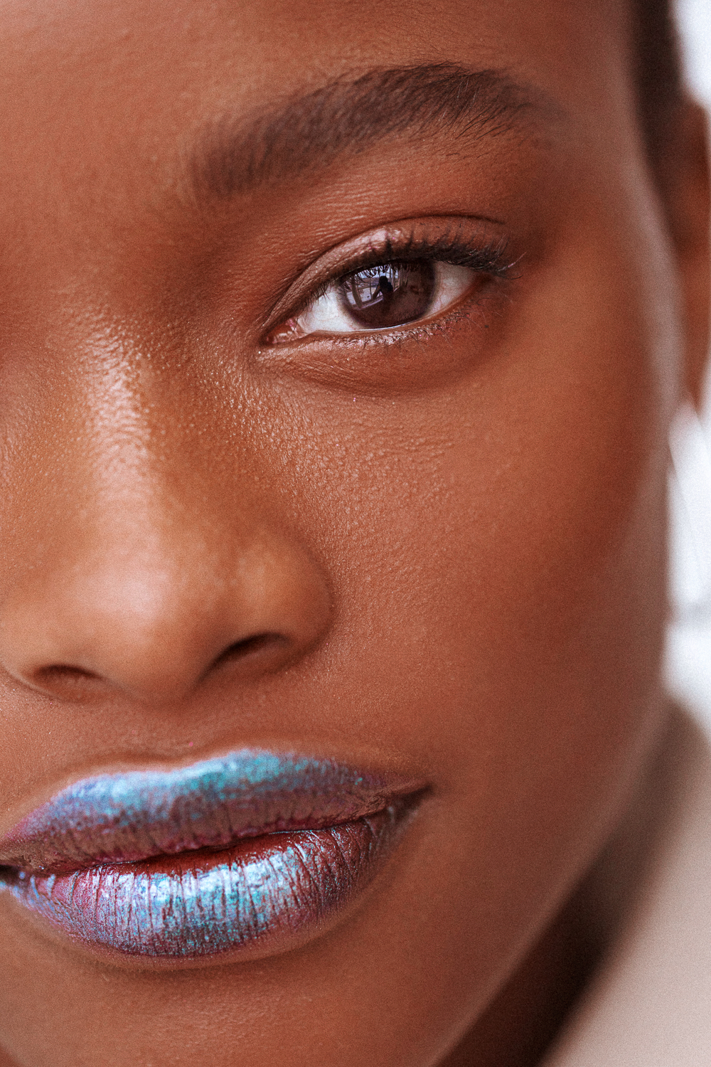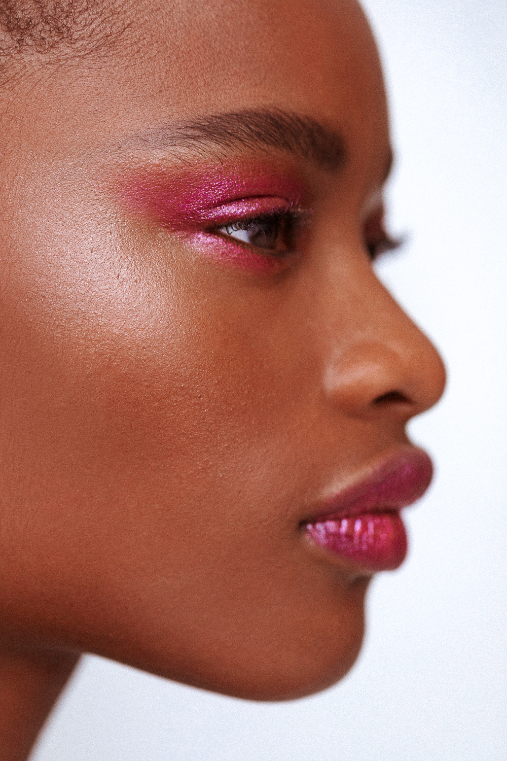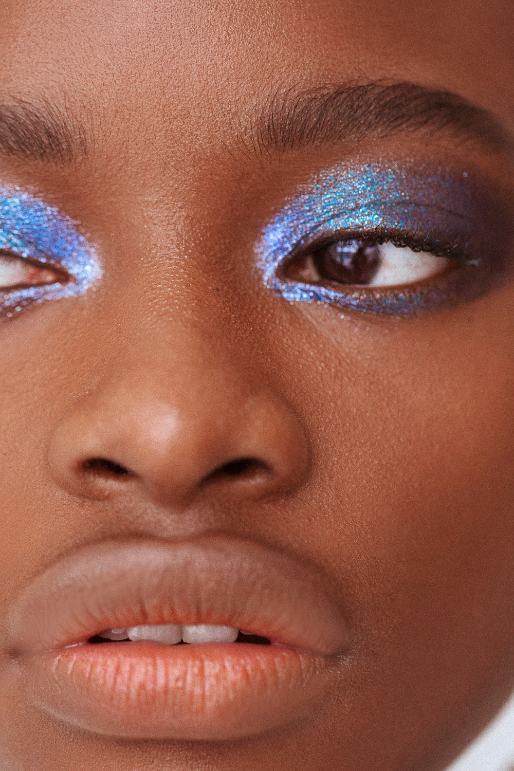 Glitter glue. But grown up. And totally dermatologically safe to put on your eyelids. Blended out, this is the easiest solution for that lid shine you've been searching for these past few years—chunky glitter with pink and blue tones that dries down without stickiness. (See it in action on Madeleine Angus here.) But really layer it on and you get what we see here on Mayowa, which is full ice queen in a way that says "Please invite me to the next Met Gala–I won't do you wrong, Anna Wintour."