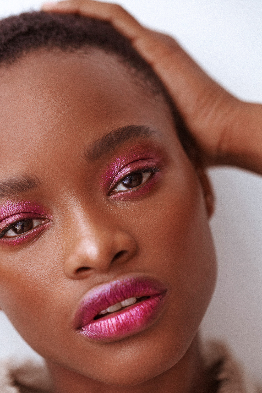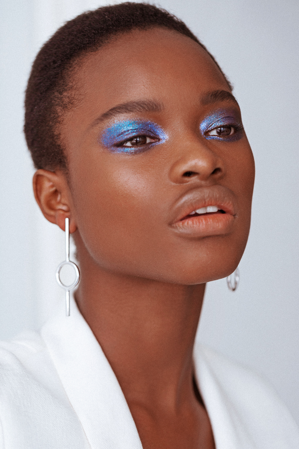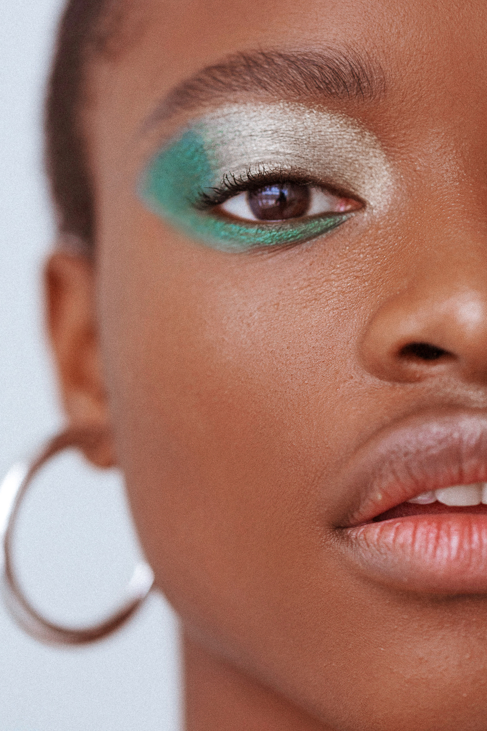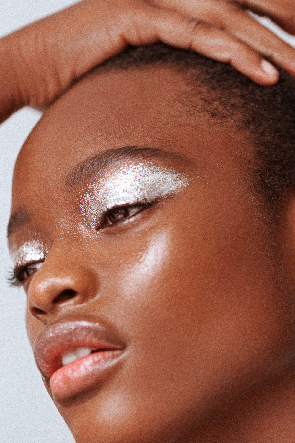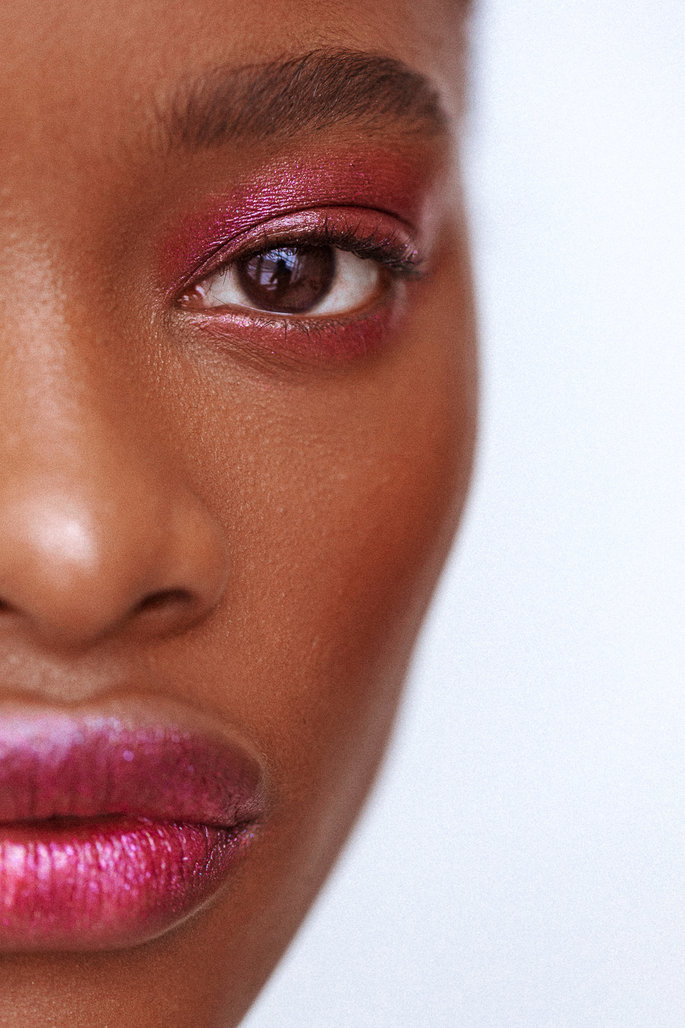 Glitter glue. But grown up. And totally dermatologically safe to put on your eyelids. Blended out, this is the easiest solution for that lid shine you've been searching for these past few years—chunky glitter with pink and blue tones that dries down without stickiness. (See it in action on Madeleine Angus here.) But really layer it on and you get what we see here on Mayowa, which is full ice queen in a way that says "Please invite me to the next Met Gala–I won't do you wrong, Anna Wintour."