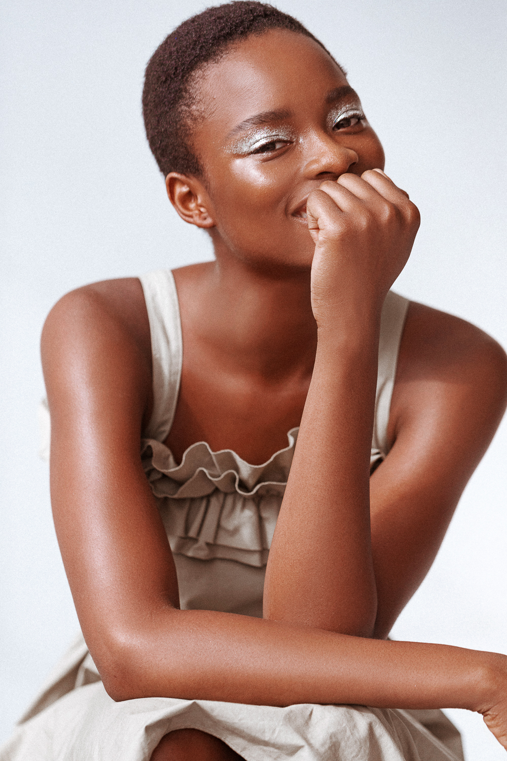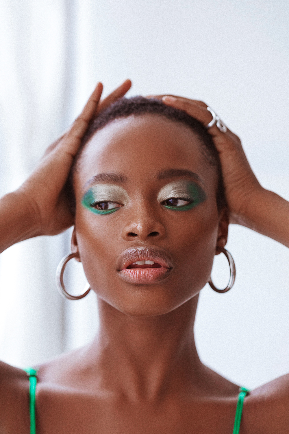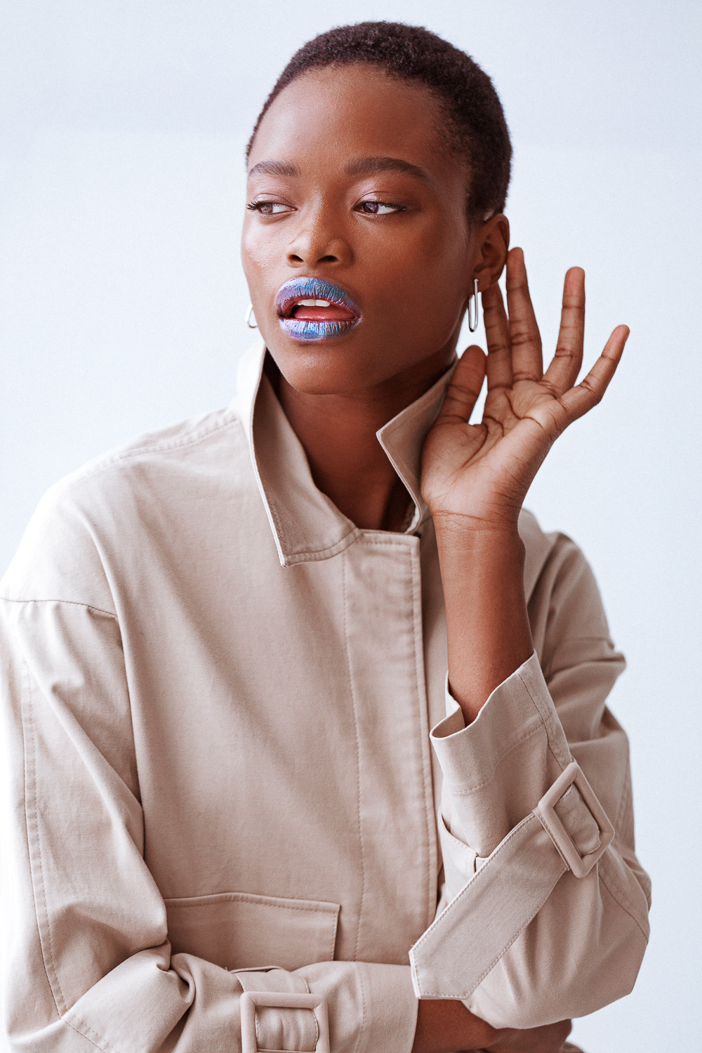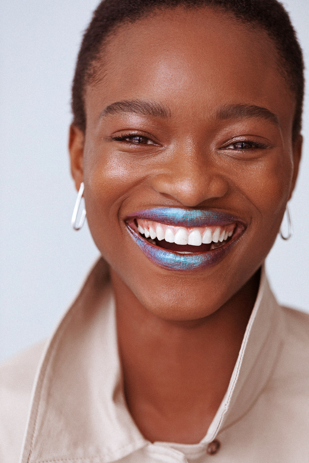 Glitter glue. But grown up. And totally dermatologically safe to put on your eyelids. Blended out, this is the easiest solution for that lid shine you've been searching for these past few years—chunky glitter with pink and blue tones that dries down without stickiness. (See it in action on Madeleine Angus here.) But really layer it on and you get what we see here on Mayowa, which is full ice queen in a way that says "Please invite me to the next Met Gala–I won't do you wrong, Anna Wintour."