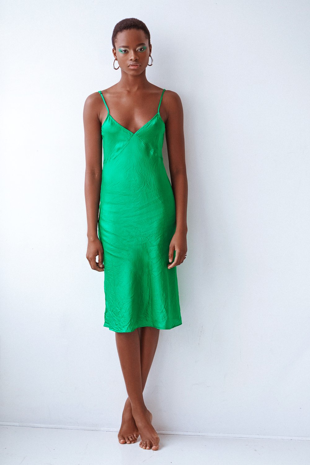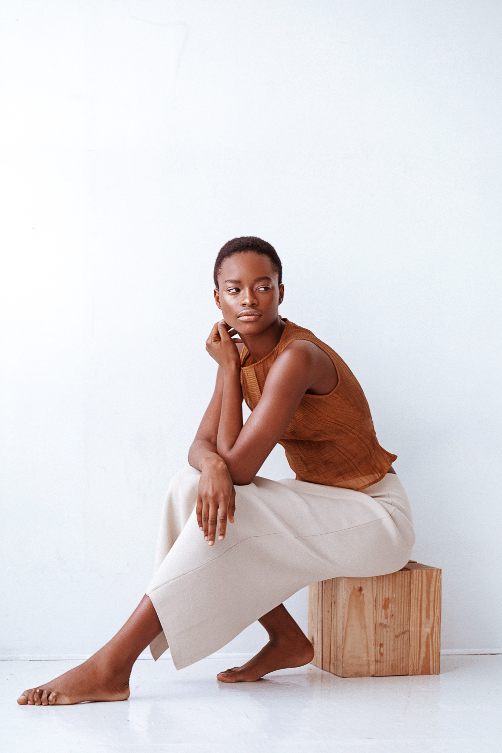 Mayowa wears dresses by Creatures of Comfort, outerwear by Nanushka, and tops by Nanushka and Samuji. Jewelry by Jennifer Fisher.