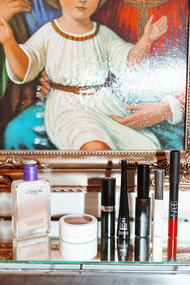 If I do real makeup, I'll do a cat eye with this Zuzu Lux liner I got from the health food store. I think it suits the shape of my eye. It feels very organic. I hate eyeshadow, I don’t think I look good with it on. I don’t like when other people do my makeup either. Like when I have to go to events and stuff I dread it. I always end up going to the bathroom and wiping so much off. They always put foundation everywhere—I don’t want that. I like to be able to feel my skin."