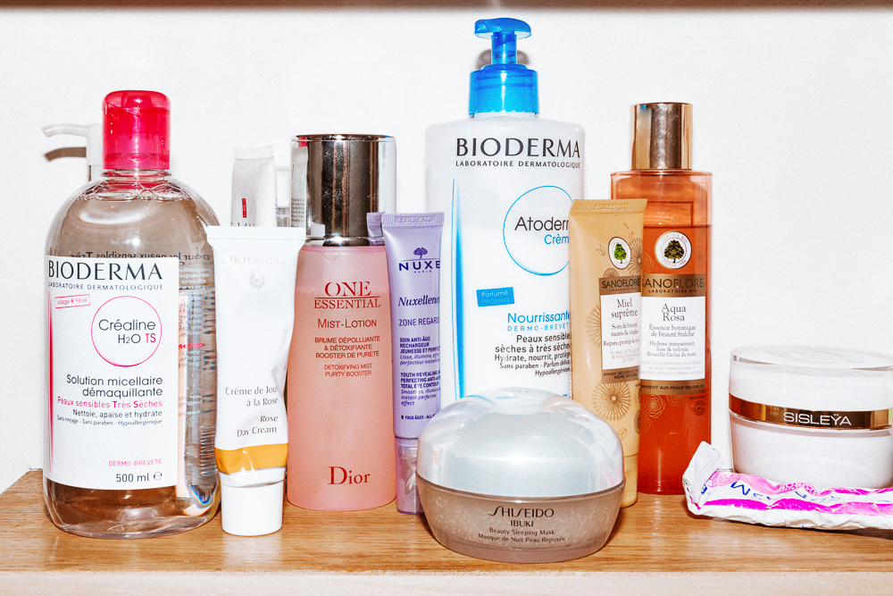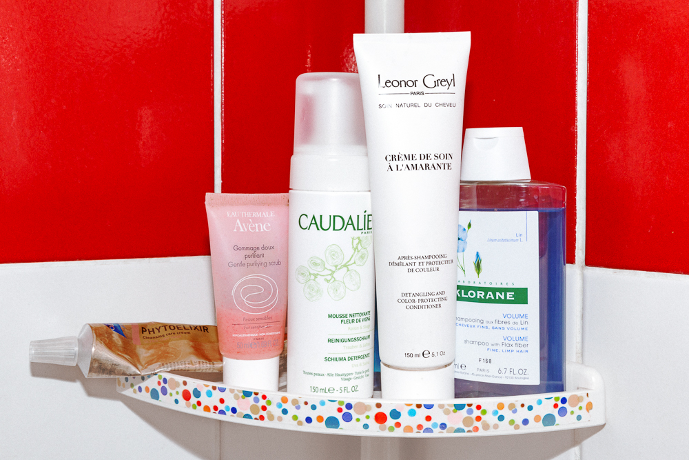 Once a week I use this Avène Gentle Purifying Scrub. It smells really good, and it just brightens up my skin. Otherwise I just use the Caudalie Mousse Nettoyante. Sometimes I use a toner—I like Sanoflore Aqua Rosa because it smells fresh, and I also have the La Prairie Skin Caviar Essence-in-Lotion. They sent it to me and I'm just starting to use it, and it gives a good glow. My moisturizer is Dr. Hauschka's Rose Cream. It's very rich and smells great, but I need to change it up. That's something a makeup artist told me, that you should change your products so your skin doesn't get used to the same things. On spots, though, I always just use tea tree oil from the organic shop. It dries the pimple. Easy.