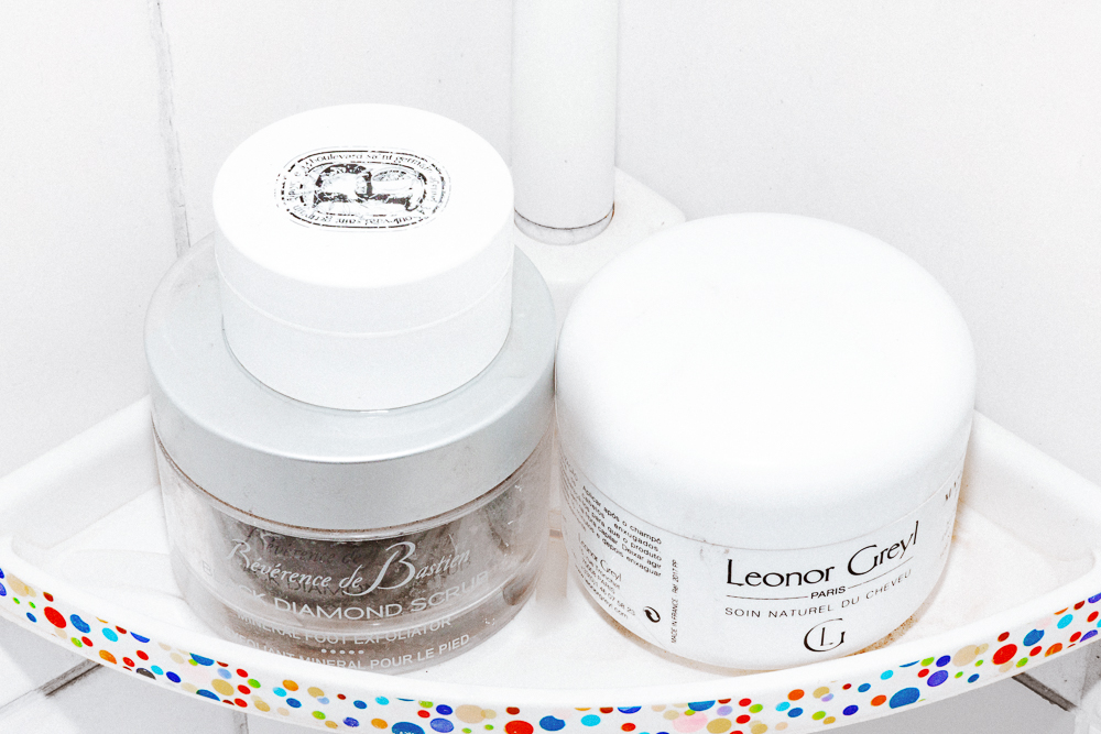 All of Leonor Greyl's products, I love. I have the jasmine hair mask, which I try to save for the bath. But I don't have a bath so I don't do it as often as I would like. [Laughs] If I'm filming somewhere and staying in a hotel, I'll bring it with me so I can really enjoy it. I'll take the Diptyque Smoothing Body Polish with me too. I wax the hair on my legs, and I like to use a scrub to remove the dead skin cells and prevent ingrown hairs. It's a bit gross—sorry!