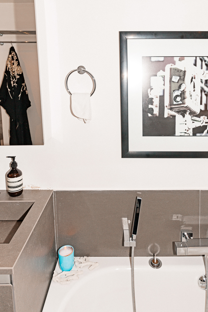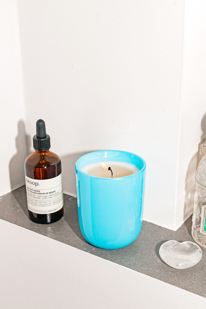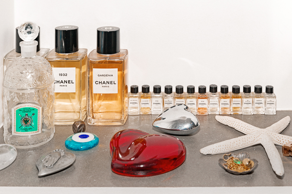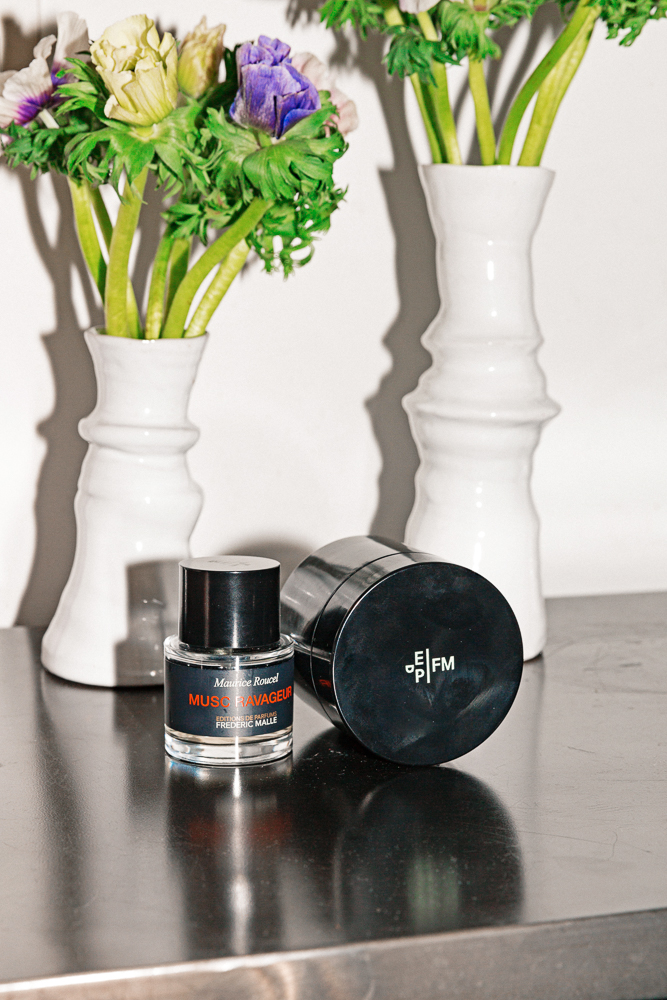 I have the Geranium Body Scrub from Aesop, which is fantastic. It's not too heavy but it's still really effective, which I like. I love the smell. My perfume, though, is Frederic Malle Musc Ravageur. It's a part of my personality. I've used it for six or seven years now... it's my smell, really. I have the body butter, too, which I use after the shower.