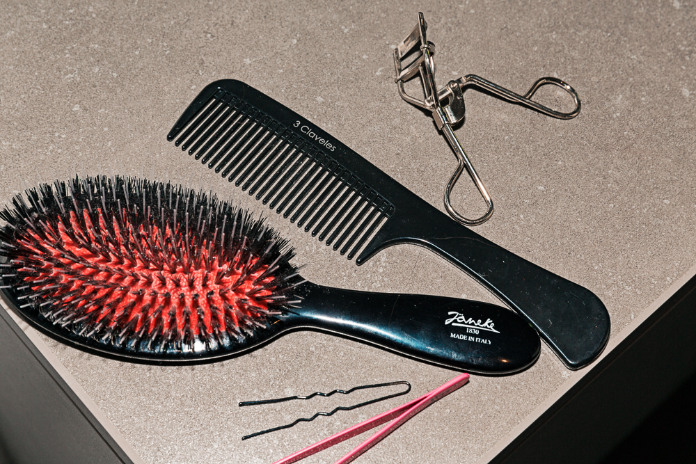 These are my natural brows, I don't touch them. When I was maybe 12 or 13, the trend was to have really thin brows, but my mother never let me tweeze them. She said they were a part of my face and my personality. Luckily, I never touched them, because now nobody can and they're exactly how they are. I brush them with Elnett and an old toothbrush, and I'm ready to go. [Laughs]