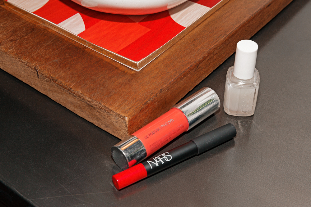 There's a woman in Paris who does my makeup if I'm going to a big dinner or something, and she showed me the Sisley Eye Concealer, which is really creamy and great. If I'm dressing up, I'll play up my eyes with shadow. Nars has really good ones, or I'll do a charcoal like Tuxedo from Laura Mercier. Then I take a little Homeoplasmine and go over and destroy it. If I do a lip, I'll do Nars Dragon Girl and nothing else. I have the Clinique Chubby Stick in Oversized Orange which I like, too.