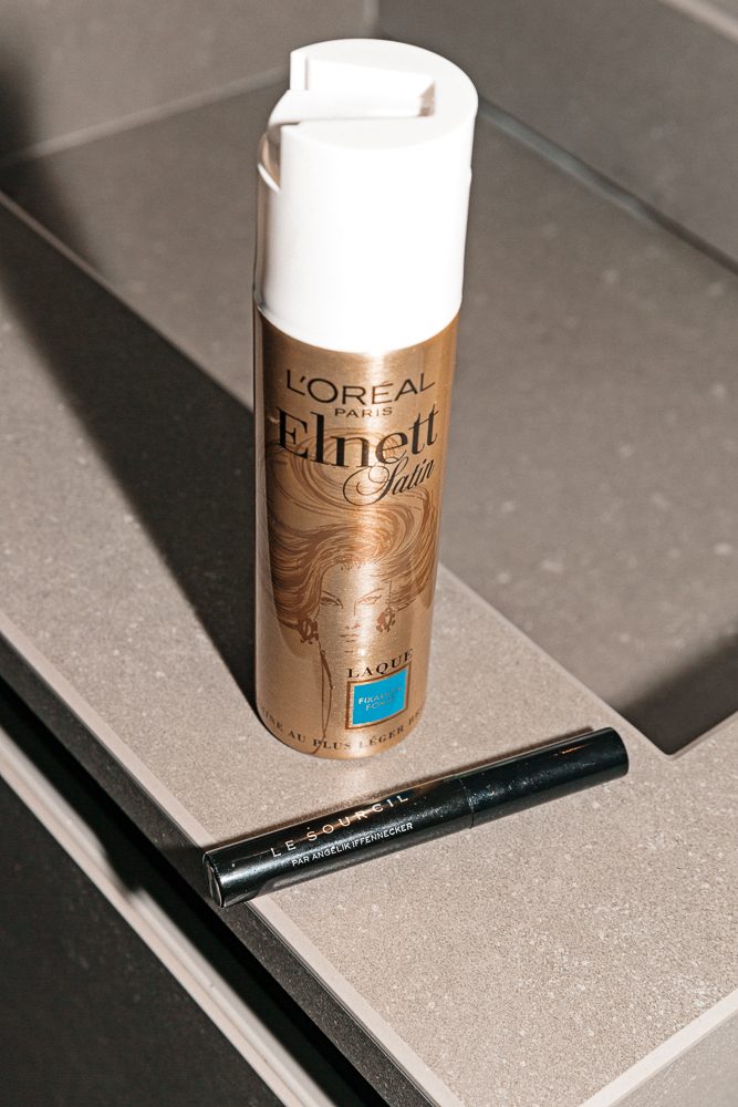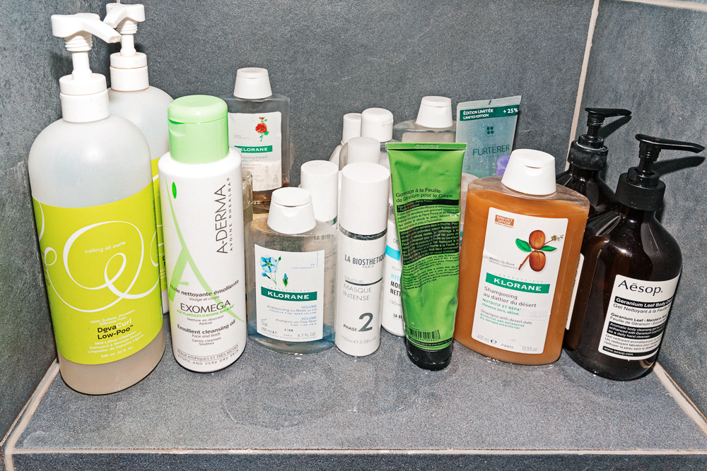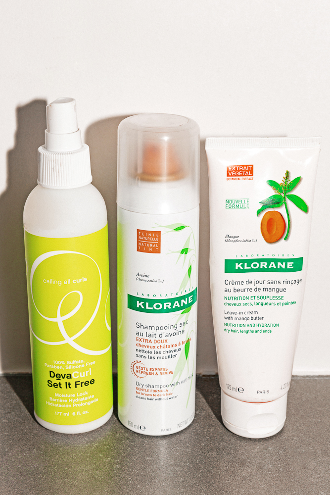 I wash my hair twice a week because it's normally really curly. For years I was doing this straightening stuff and at one point, it was too straight. Also, there's this idea of the French girl with her straight hair—but I wanted to be who I was, and I have curly, wavy hair. Now I still straighten it sometimes but not as much. I use Devacurl's Low-Poo, and then there’s the Set It Free Spray you can use after. Sometimes I use the Klorane dry shampoo, because it's really good. But that’s it. Super fast and super easy."