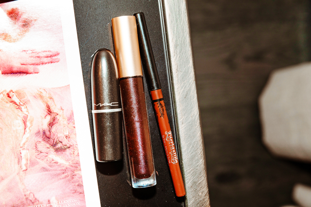 I can't really beat my face. Duckie doesn't do makeup so well. My sister teaches me things—whenever we used to go out I'd ask her to do my makeup, because she was always better at it. I'm still working on my eyeliner wing. [Laughs] I usually go for a gel at night, I have this gel eyeliner from Bobbi Brown that I love. I could never apply fake lashes, but they always look so good... Instead I just use the Max Factor Volume Mascara. I love when my lashes look long—it just opens everything up. My lipstick tonight is a nude Kat Von D Crucifix Liner just to give some color. But Duckie's also going through a dark lip phase—MAC in Living Legend is the one I've been reaching for. I like Lucas Pawpaw for my lips, too, which is an Aussie thing. I make sure to always have one of those with me.