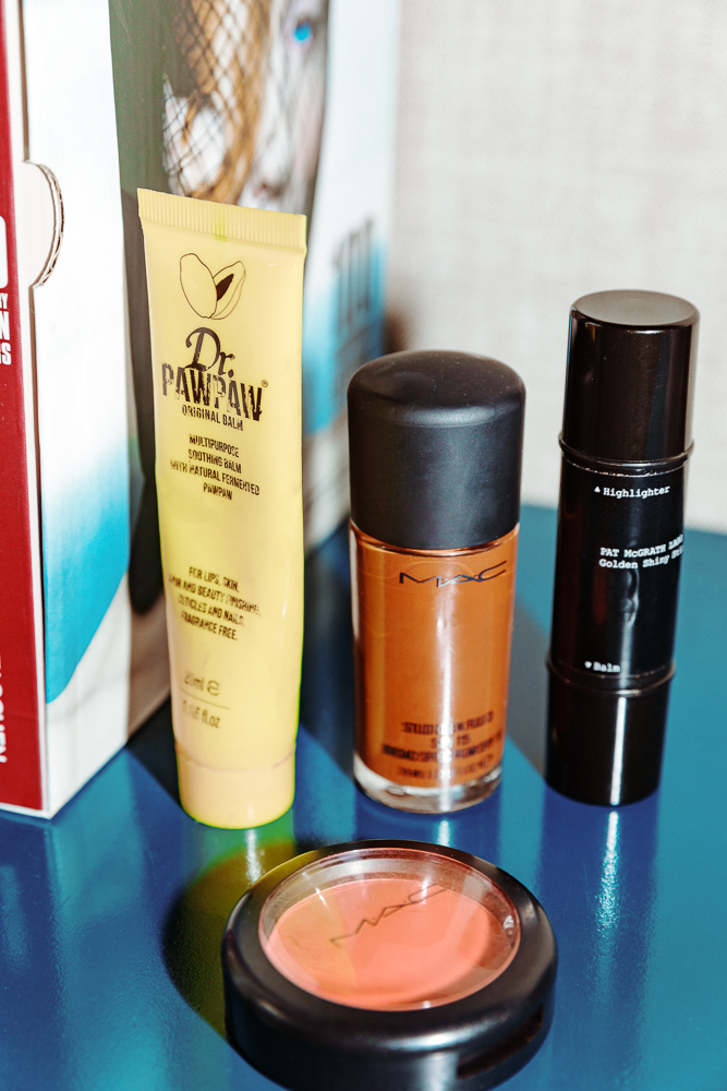 MAC Studio Fix in NW50 is my base. They have a really great color palette with red undertones. I loved the Matchmaster in 10 but they discontinued it... They're done. It's so sad. It was the perfect tone! I only have a little left. I apply with my fingers, but I'll use a Beautyblender if I'm feeling really bougie. My blush is MAC's Burnt Pepper, and I've been using Pat McGrath's Skin Fetish in Golden. I love her makeup—she has a gorgeous gloss as well. I do my cheekbones and bit in the browbone. It's really shiny. Maybe it's because I'm in New York, but I feel like the more glitter, the better.