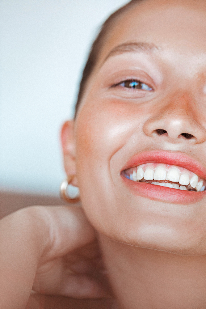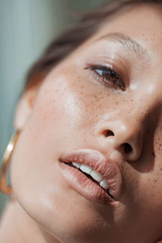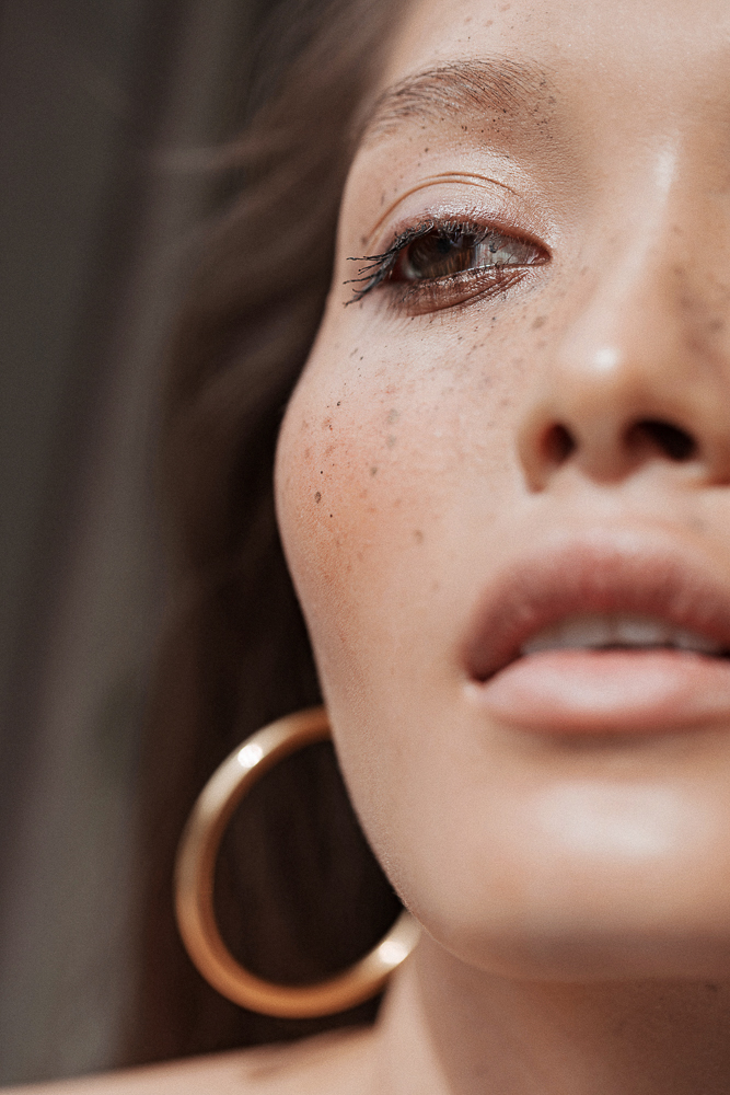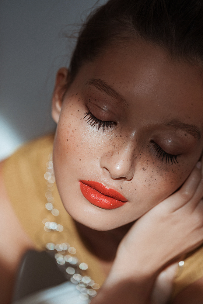 "Freckles normally have a blond, ashy feel to them—perhaps with a bit of gold—so I mixed gold and dark pigment with mixing medium, applied it to a toothbrush, and just flicked it all over. That makes it random, because people can't choose where their freckles are. Then I dotted in some other ones with an eyebrow pencil. Some are small, some are big, and it looks really organic."