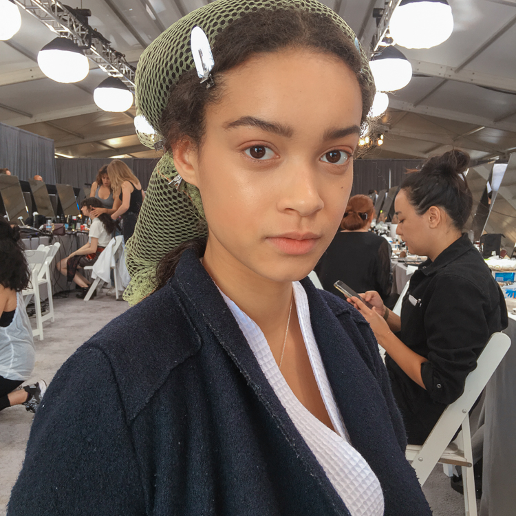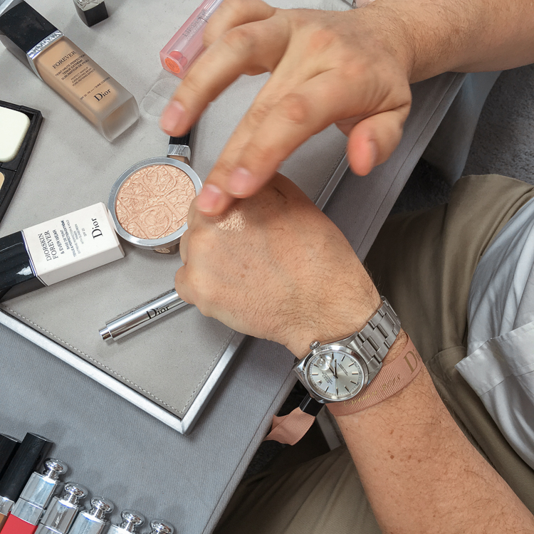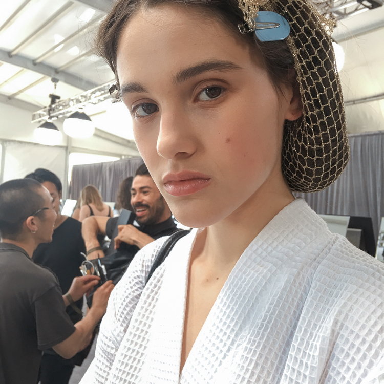 I know powder doesn't always seem chic given today's penchant for dewy, glowy skin. But we were at a fashion show in May in what looked like a desert—and all the models were matte enough to look like they traveled there with their own personal A/C units. The only answer was an imperceptible layer of powder—but how? "Pressed in with a puff," Peter said. "First I actually take the excess oil off with a Kleenex, and then I push the powder in. Brushing it onto skin that doesn’t already have that much powder on it doesn’t tend to stay very well. It’ll stay better and look less obvious when it’s gently patted on.” And just like that, the secret to summer makeup was revealed.