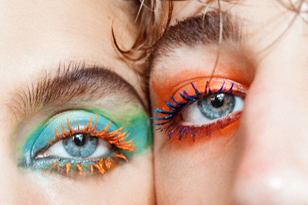 Rays of neon cast against moody color fields. The mascaras here are YSL's Volume Effet Faux Cils along with some unfortunately discontinued orange Chanel mascara. "It's an interesting way to experience color," said Lucy. The cream shadows, which also came from YSL, were applied imperfectly with fingers and then traced and smudged with Vaseline. "I love it to feel melted and organic."