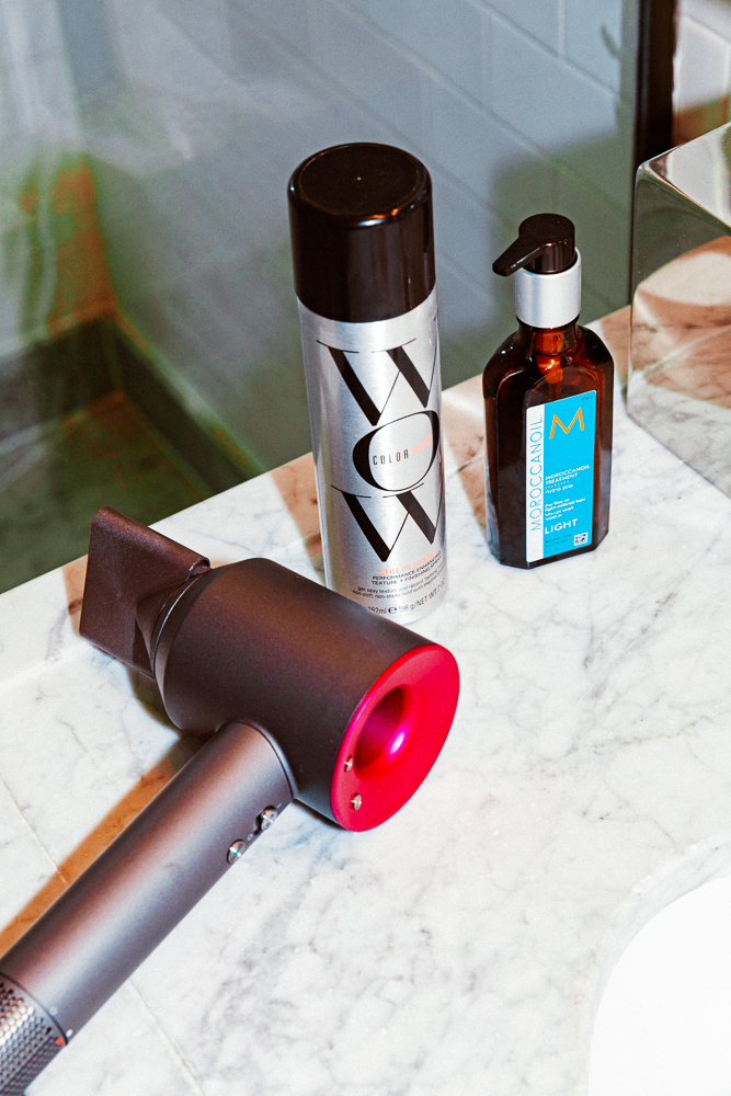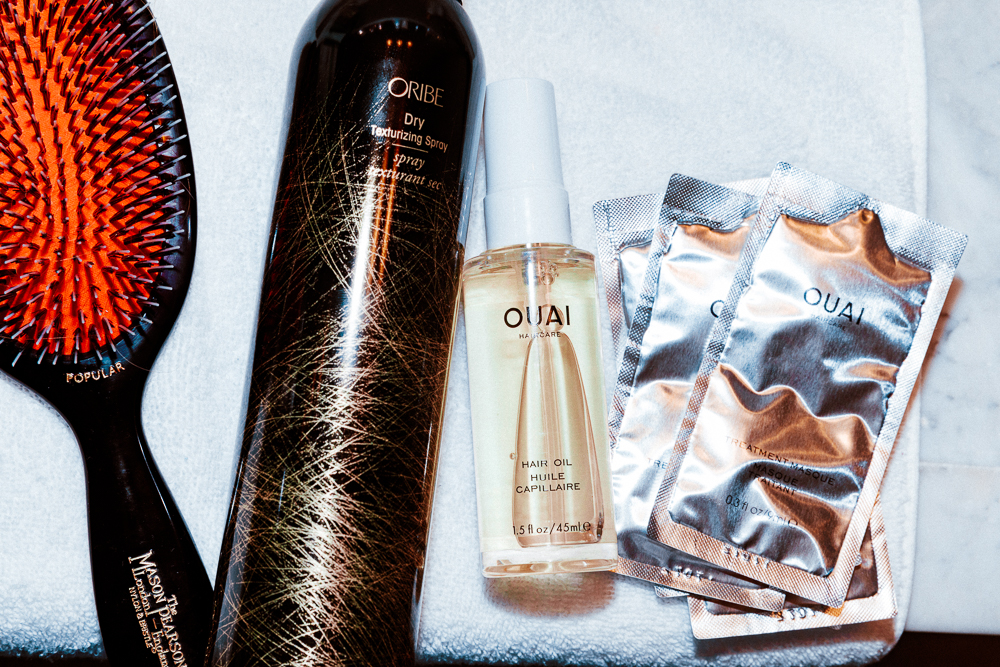 I’ll wash my hair before going out, and sometimes I’ll have a hairdresser, which is fantastic. To style it I’ll use the Oribe Dry Texturing Spray and some Moroccanoil on the ends. I also use a bit of the Ouai Wave Spray. This is always my look—I don’t really play with it. I’m always like Brigitte Bardot with a bit of rock n’ roll.