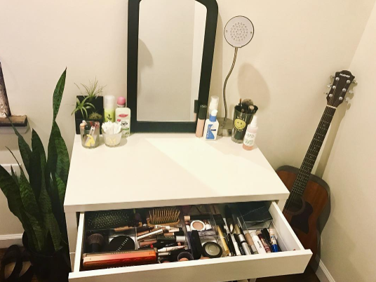 My happy place is at my vanity, either in the sunny morning cranking out my daily routine, or before a night out with a glass of wine experimenting with different makeup looks. I get a lot from Youtube tutorials, but mostly, my makeup is all about glow. I swipe Maybelline’s Better Skin Concealer in Ivory under my eyes, on my chin, and on any blemishes or red spots. To blend it out, I use my Beautyblender, but I dampen it with the Mario Badescu Facial Spray. I hate how soaking it in water can make it smell like mildew, you know? Then it's Glossier Cloud Paint in Beam on my cheeks, and Haloscope in Quartz on my cheekbones, nose, brow bone, and Cupid's bow. I lock everything in afterwards with Becca Multi-Tasking Perfecting Powder in Fair. If I'm going out, I contour with Smashbox's Contour Sticks, which are pretty much foolproof. I like the idea I can give myself a nose job with a makeup product.