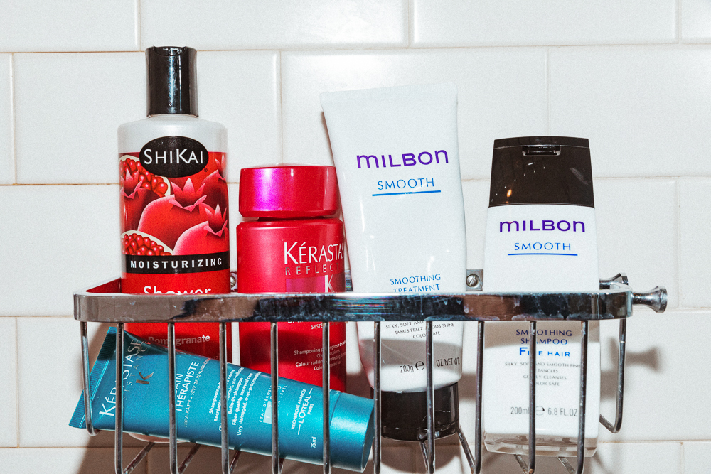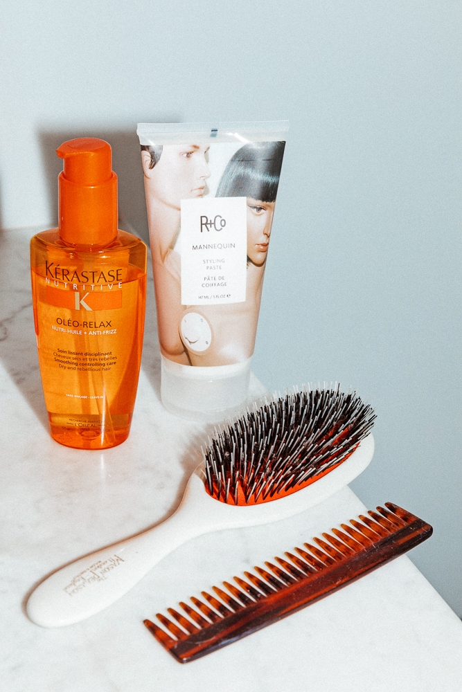 These days, I go through varying shades of red. A few years ago I looked up who does red really well in New York and I found Marie Sigismondi. She just gave me Milbon Shampoo and Conditioner that's good for finer hair. It's Japanese, I think. Otherwise I just use Kérastase, which I discovered in Italy when I was younger. In fact, when I'm there, I still stock up. From what I understand, it's best to wash your hair as little as possible, so I wash it once a week. After I get out of the shower, I generally use a little of the R+co Mannequin Styling Paste and Kérastase Orange Classic Oil and twist up my hair and leave it. That'll take any frizz away, and I'll use them again throughout the week, or before dinner. Those are kind of my essentials. All I want is for my hair to look neat and simple. Just like my jewelry, it's perfectly imperfect, so I embrace that.