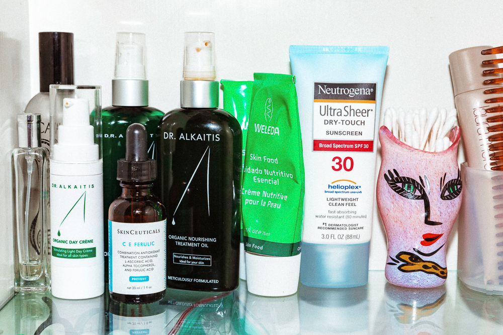 SPF every day—I've been doing that forever, and I'm trying to get my children to do it, too. I've been taught well by my mother. Neutrogena Ultra Sheer Dry Touch is great, because it goes on really light and not oily at all. I love Weleda's products—I use the Gentle Cleansing Milk twice a day. It takes your makeup off and leaves your skin feeling moist, too. That's key to me. I don’t want anything that feels like it’s completely stripping me of moisture... That’s not good. The other thing I love is this Dr. Alkaitis Organic Toner. I like his daytime moisturizer, too. If I'm working from home, I'll just slather it on. It’s got a good group of oils in it—it does have Vitamin D and E complex, so it is nourishing. It's lasting moisture, too. It's more of a treamtent thing, but I do love the Skinceuticals CE Ferulic. I'll skip the toner and rub that in. It feels like I'm working something.