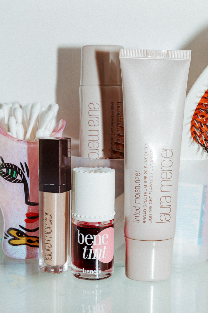 The Laura Mercier Tinted Moisturizer is something I've used for a million years. I like it because you don't really see it. Again, it's all about looking groomed but keeping everything super natural. This Lancôme Mascara Base is probably the most complex I get. My biggest fear with mascara is that it ends up on my cheekbones, so I think this helps. And then I use the basic Maybelline Great Lash. I used to use Lancôme mascara, too, but I've found that this one stays in place. I just put it on the upper lashes, and it just makes my eyes open and pop a little bit. Plus a little Laura Mercier Eye Basics on my eyelids. Just a neutral shadow to brighten and even things out.