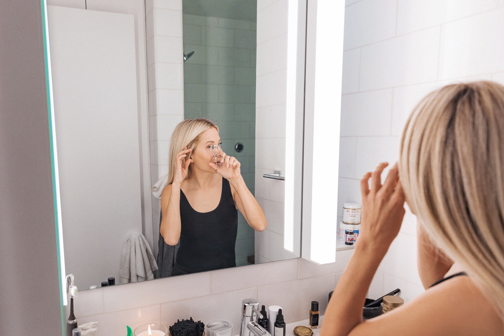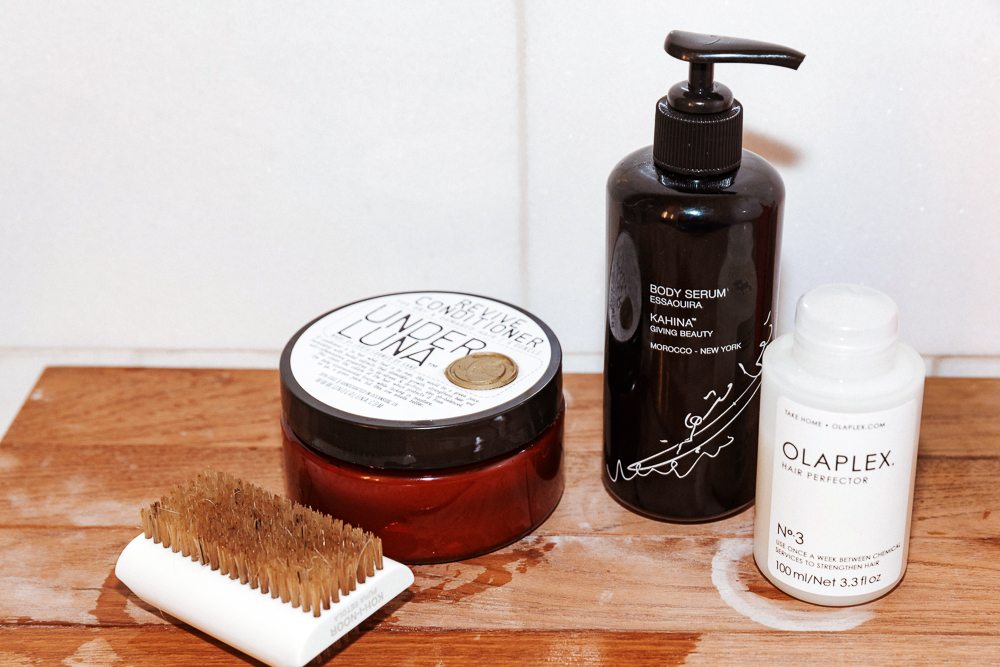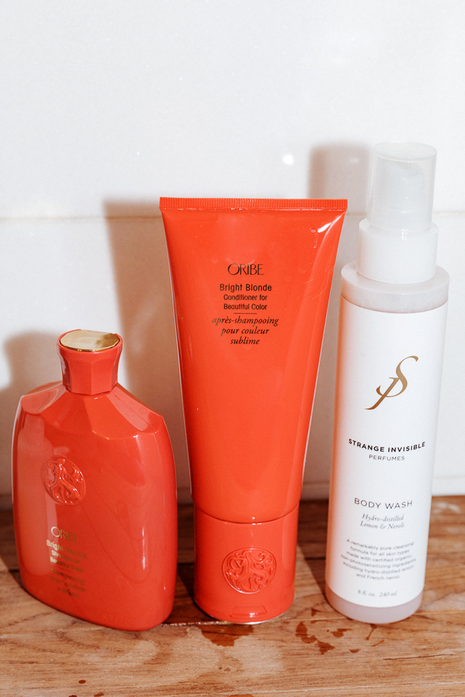 Olaplex was just recommended to me. I do it once a week to restore [the color] and make sure it stays healthy. I also love Revive Conditioner Under Luna, which smells like a banana smoothie. I mix in a little bit of the Oribe Bright Blond, leave it in for 20 minutes, put a Muji hair towel over it, and then wash it off. That keeps the color fresh.