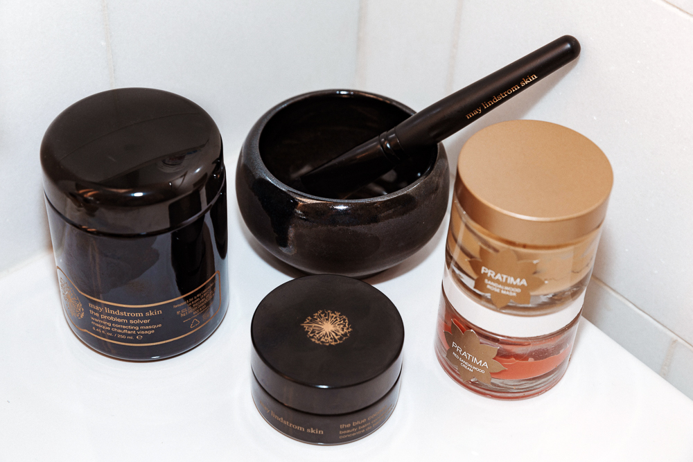 But this May Lindstrom Problem Solver Mask is the star of the show. It transforms. When you mix it it's all frothy, and I love painting it on. I make everybody do it when they come over. And it doesn't dry out your skin, or make it so you can't talk—you wake up the next morning with perfect skin. It pulls everything out. If I have a little blemish, I use this Pratima Sandalwood Soothing Lotion. It's incredible for spots, and it's pretty. The Sandalwood Rose Mask is awesome, too. It calms, it's woody—I'm a Virgo and it's very grounding. [Laughs]