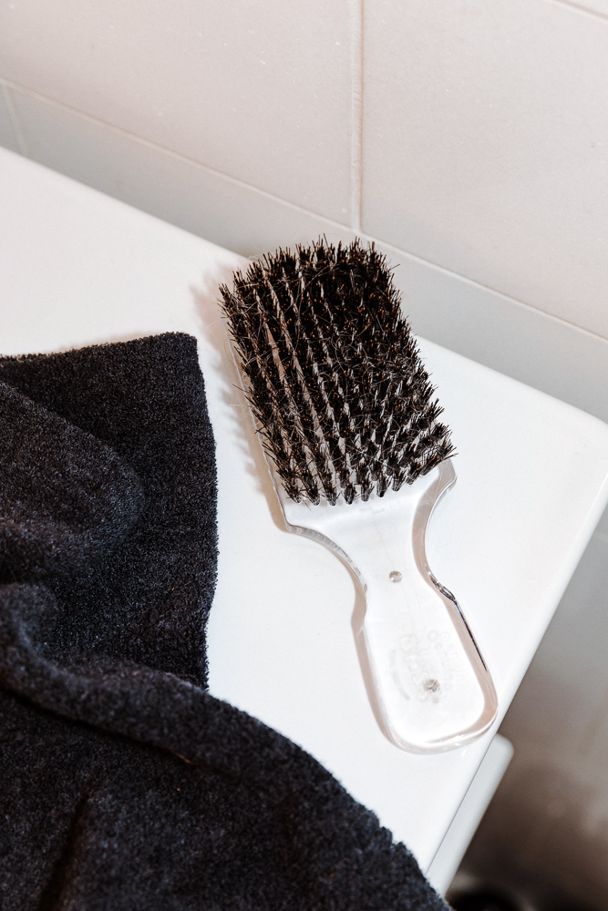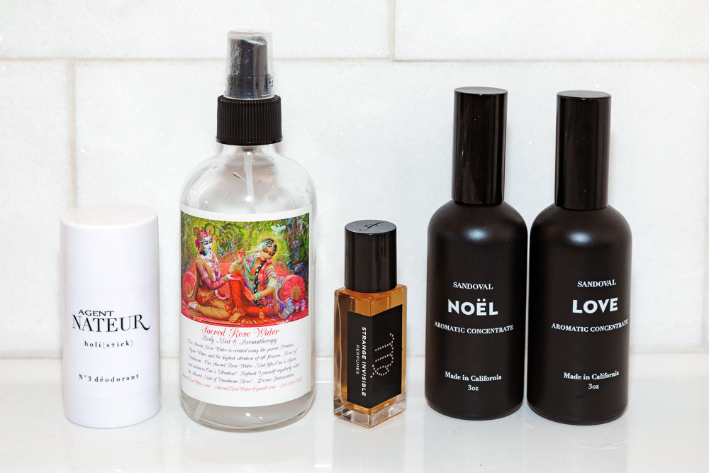 Dry brushing is another thing I do daily—I'm in love with my dry brush, which is Japanese, and I got it from Tortoise General Store in Venice Beach. You always brush towards the heart, right before you get into the shower, and you slough off all of the junk. It's incredible for ingrown hairs, and it's good for the lymph. I also make my own body scrub out of salt and sugar and whatever oils I have on hand, but if I don't have anything, I'll just do the dry brush. After that I'll use this Strange Invisible Perfumes Body Wash, which smells like neroli, and I pat the Kahina Body Serum on all over. That has a some neroli in it, too.