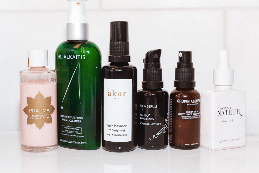 Then I have these Ursa Major face wipes I use in between steams. I'm very particular about wipes, but these don't have a strong scent, and they don't leave a film. I always have a couple of those in my bag. I also love this Dr. Alkaitis Organic Purifying Facial Cleanser. All of his products are really good, but this is the best. It resets my skin. If I'm working out, I put on this Grown Alchemist Hydra Mist with Desert Lime. I mostly use oils instead of creams—I like this argan oil from Kahina Giving Beauty, which is an amazing company. When I do use creams, I like something heavy. May Lindstrom's Blue Cocoon fixes everything. I also like Egyptian Magic, which is so cute. That's more for my body when I need to hydrate all over.