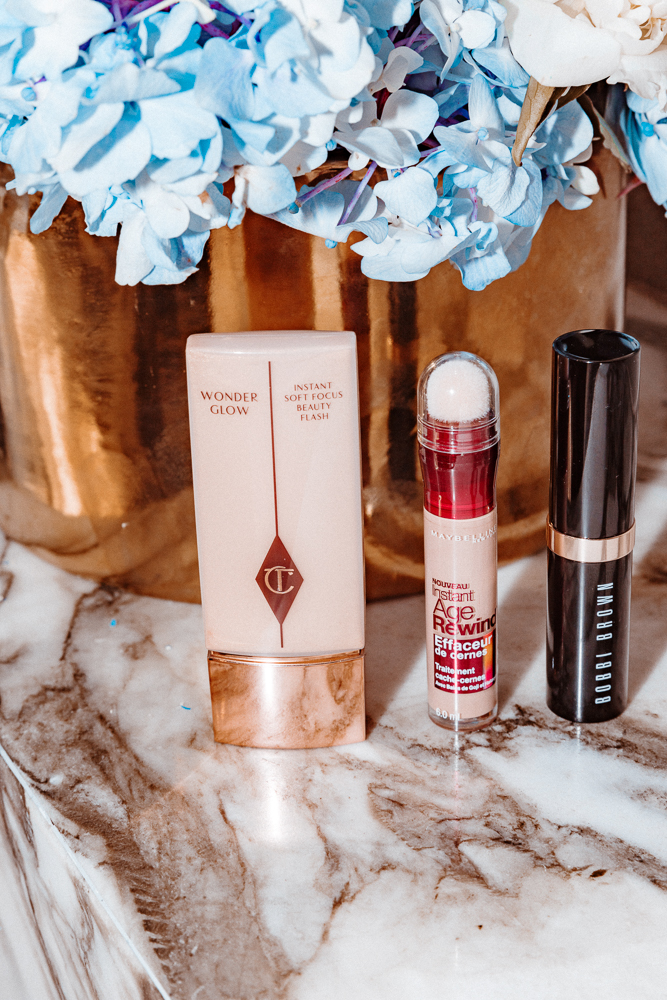 I have this Charlotte Tilbury Wonderglow Skin Care Primer, too, that I use before makeup. It makes my skin glow. I used to use MAC Strobe Cream everywhere, but then I saw somebody just using it under their eyes, so that's what I do now. My coverage is Bobbi Foundation Stick in Honey, and I blend it with a Kiko Foundation Brush. Today I didn't wear too much—sometimes I'll just wear Maybelline Age Rewind Eye Concealer. I love how that doesn't move around, and it doesn't crease, or anything. It's really easy. On bare days, I'll do that and blusher. Blush kind of gives you life. I like Bobbi Brown's the most, but I've been using this Chanel Crème Blush in Intonation. I'll use it on my cheeks, lips, and the top of my nose.