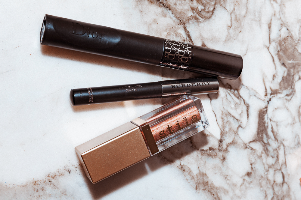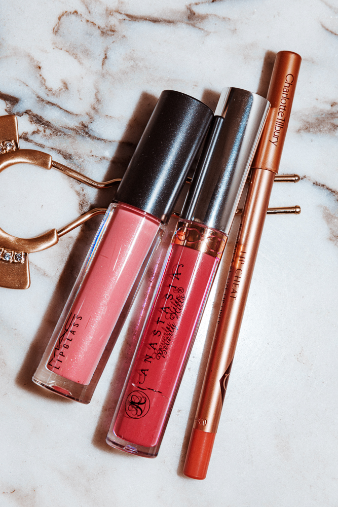 My lip is this Anastasia Beverly Hills Liquid Lipstick in Dusty Rose I got from Sephora. It's really nice, but it's a bit dry, so I'll put MAC Mineralize Glass in Eloquently Elegant over top. I do my brows with this Miss Sporty Just Clear Mascara—I used to use a brow gel with a tint, but I feel like they don't look like your natural brows. This does. Right now I'm using the Dior Pump'N'Volume Mascara, which I got from an event. That's my go-to mascara now.