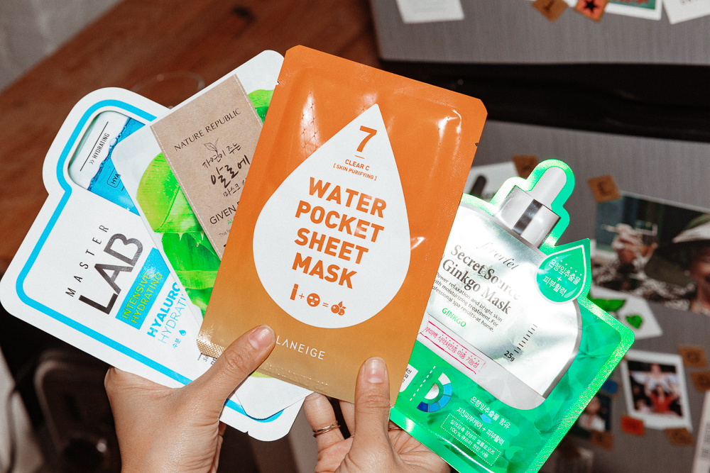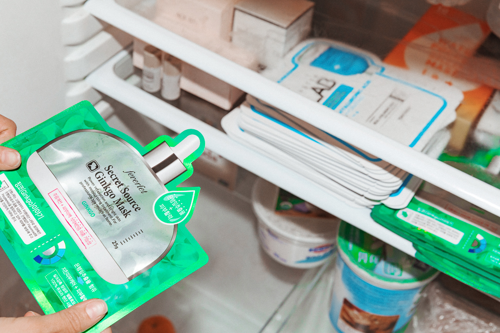 Once or twice a week, instead of all of that, I’ll do a sheet mask, which I keep in my fridge. My favorite one is the Feverlet Secret Source Ginkgo Mask that my mom sent me. You put it on for 15 minutes and then pat the rest of the juice into your skin when you're done. When you wake up, your skin is really glossy.