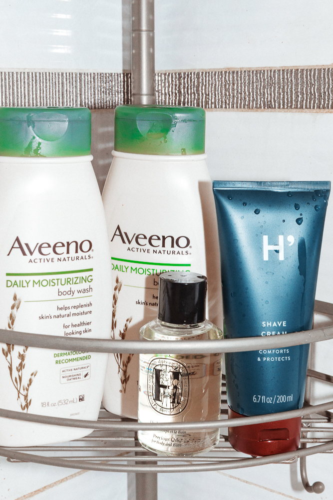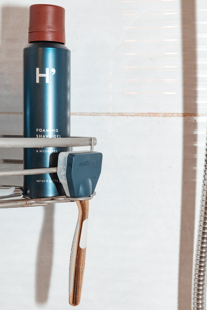 Obviously, I shave with the Harry’s razor. I keep one in every travel bag I have, and in my shower. I don’t have to shave very often, but I do love the smell of the products. I love our foaming shave gels, but it’s actually really thick, and the smell is really great. It has notes of eucalyptus and aloe.