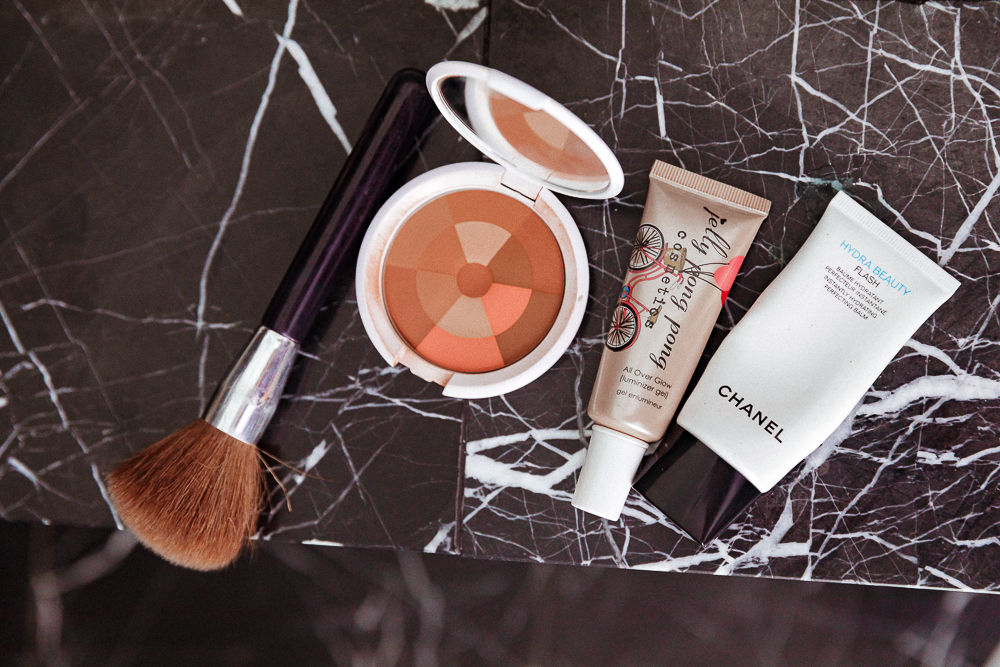 I have this thing I just discovered. It’s the Jelly Pong Pong All Over Glow Luminizer Gel, and I just put it on my cheekbones. It looks so good! It’s not shocking, it just makes you look shinier. It’s fun at night. Even if you put a lot on it’s not too much, you just glow. I’m into that right now. Then I like the Clarins Mascara Intense Black because it really separates the lashes without looking spidery, and makes them long. I definitely put more on at night than the day. But this one, the Lancôme Grandiôse Extreme is more impactful—it really shows up on the lower lash line. And I like this, the YSL Babydoll Kiss & Blush Duo Stick in 3. It’s really subtle, and in the summer, the pink works well with a tan. That's good—I holiday in the South of France, Italy and Spain, so I've spent a lot of time in the sun.