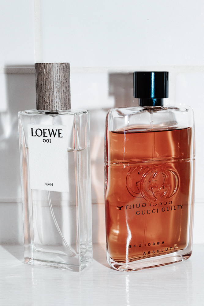 My deodorant has to have no smell. This Dove Invisible Dry is actually supposed to be for ladies, but it doesn't have an odor and it doesn't stain my clothes. If I'm wearing fragrance, I want to smell like that, not my deodorant. I recently started wearing Loewe 001, which is their only scent for men. In a way, it’s woody and warm without being too much. It’s not pungent. It’s good for every day. My other one is Gucci Guilty, which is a bit spicy. It’s warmer than the Loewe, so it might be better as a evening fragrance actually.