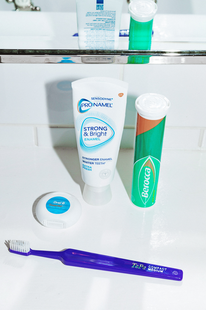 And I’m absolutely obsessed with flossing. I go crazy if I don’t have floss on me after a meal. In the pocket of any of my jackets, you’ll find floss. I also prefer small toothbrushes because I feel like you can reach better. One of my best friends is a dentist, and he gives me the TePe Mini brushes. I don’t even know where he gets it.