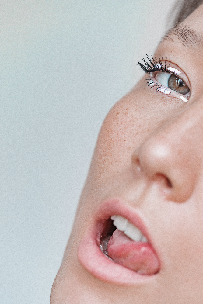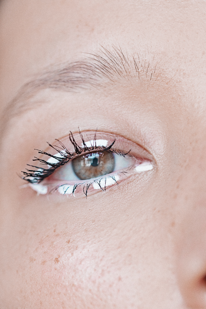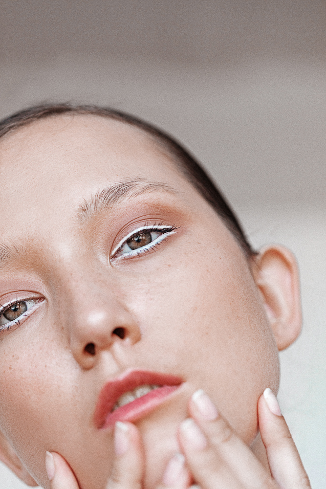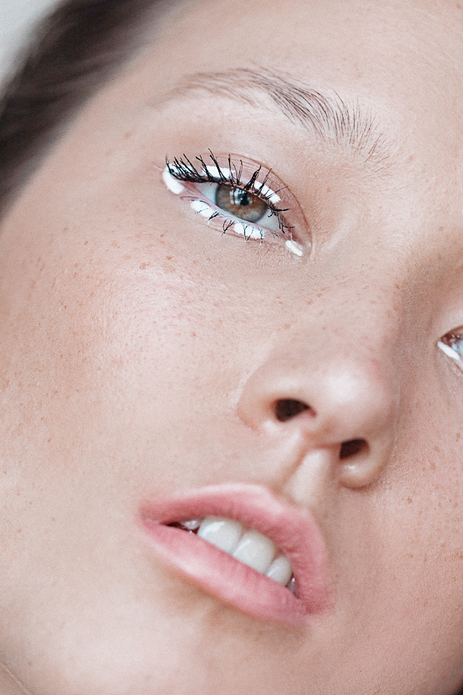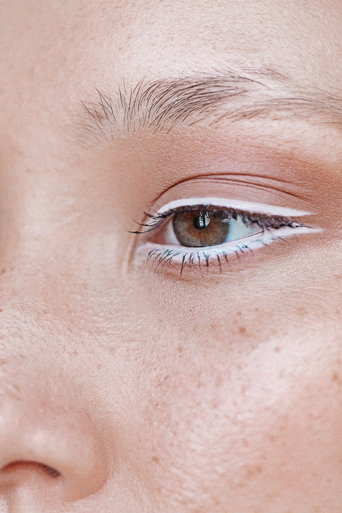 “I started with a base of Armani’s Eye tint eyeshadow in Spice Smoke. That helped me create a contrast with the white on top and gave me a little room to give her eye a little more shape and contour. Then I used the Lancôme White Kohl pencil in Alena’s waterline and all around her eye, but not connecting perfectly at the edge. Tapering it out instead. Lancôme is not waterproof, but it stays. I love those kohl pencils. The consistency is the perfect balance between powdery and waxy. It’s blendable; it doesn’t move around; it doesn’t really set in way that’s not going to move, but you can play with it and use it as an eyeshadow base, waterline, outer rim of the eye. It’s super versatile.”