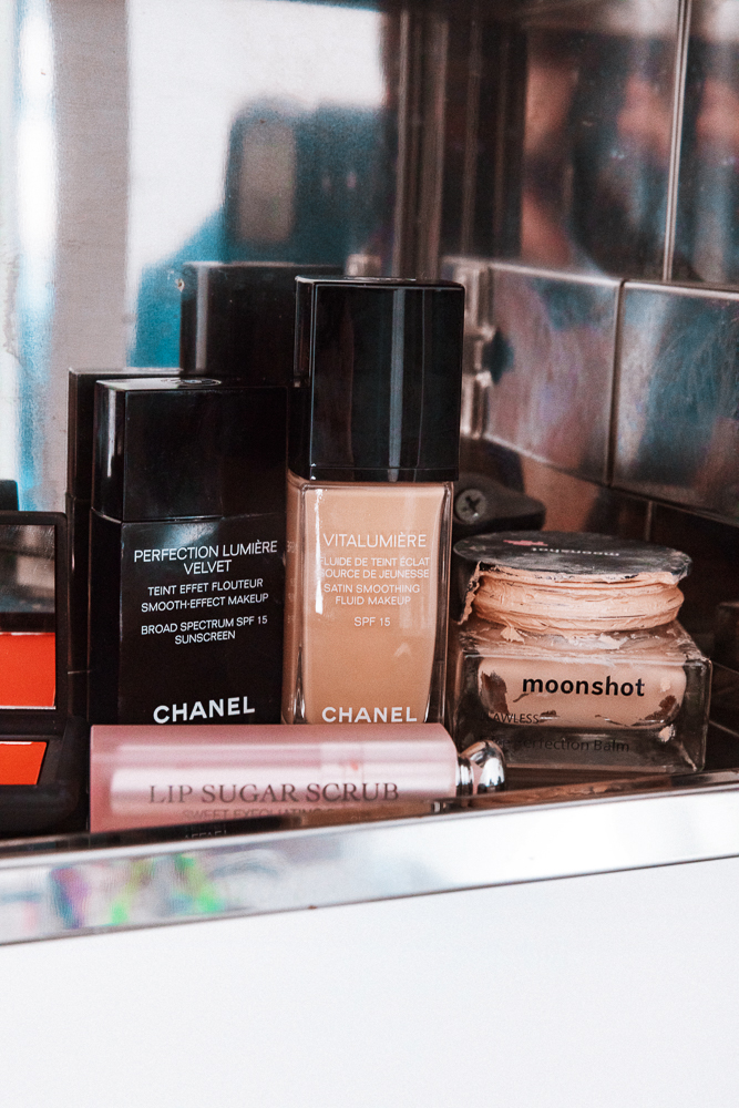 I always use Chanel Vitalumiere Foundation. I’ve also been using this Korean one by Moonshot. I’ve gone through it twice. They make a foundation for people as white as me. I use this if I’m pale, and I use the Vitalumiere if I’m yellow– which people do say is heavy, but I’m using it on my skin now and you can’t see it. I’ve always worn foundation because of my bad skin, even if it’s just in my head. I wait for the Weleda to settle first, and then I’ll do the foundation on my way to work in an Uber. I’ll wear lip balm as eyeshadow and lip balm. The Dior Addict Lip Glow is amazing and has a teeny bit of color, just a pink glossy one.