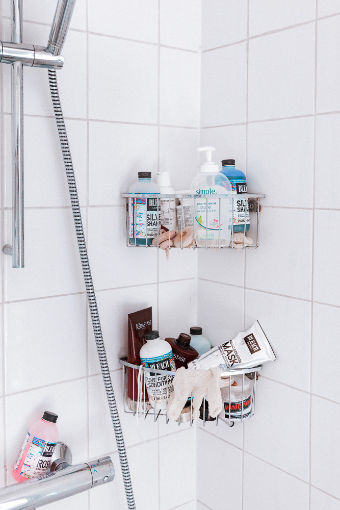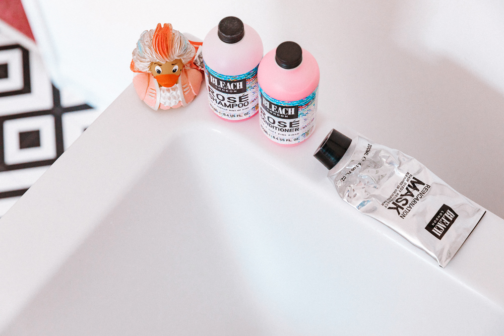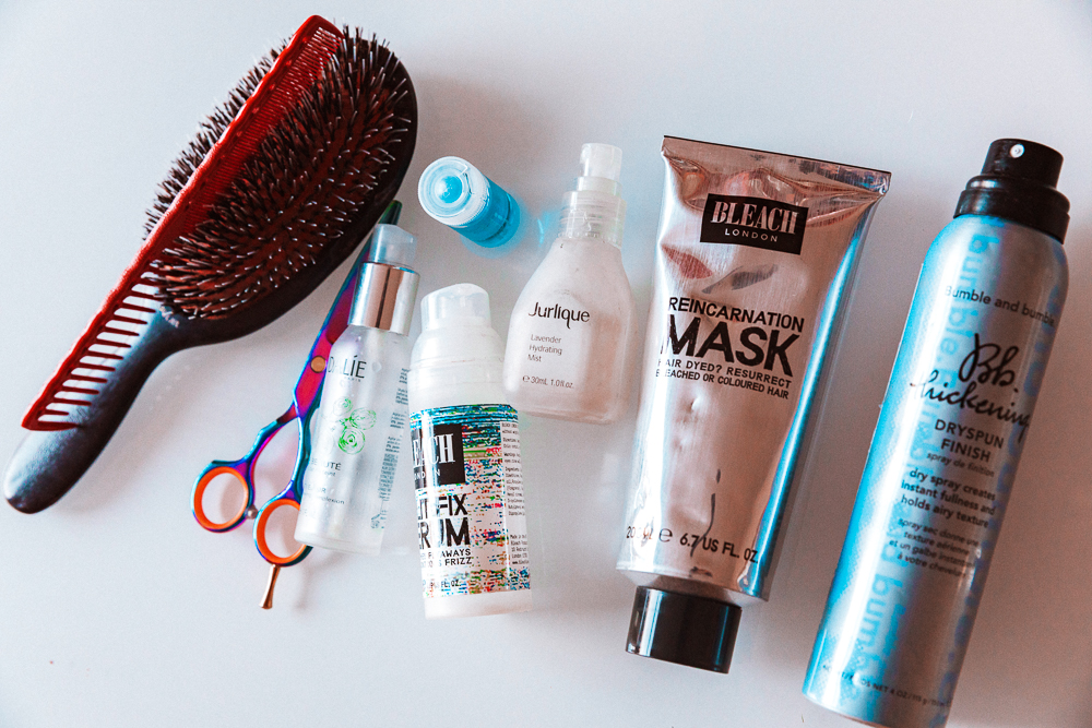 Before I get in the shower, I brush my hair with a Mason Pearson or a Tangle Teezer. I use the Bleach shampoo and conditioner everyday, but then in between I use Kerastase Reflection Bain Chroma Riche. That’s got loads and loads of shine so I can’t use it every day because it’s a bit heavy. But if it’s feeling dry, I’ll use that. I’ve been using Alex-Plex, which is a bond we’ve been developing. Basically, what happens is a bond goes into the coloring process and helps strengthen it. Then, you use a treatment to maintain. It’s a bit similar to the Philip Kingsley Elasticizer Pre Shampoo Treatment, but it’s not as heavy and it’s more moisturizing. I use it as a conditioner sometimes and as a treatment after the coloring process.