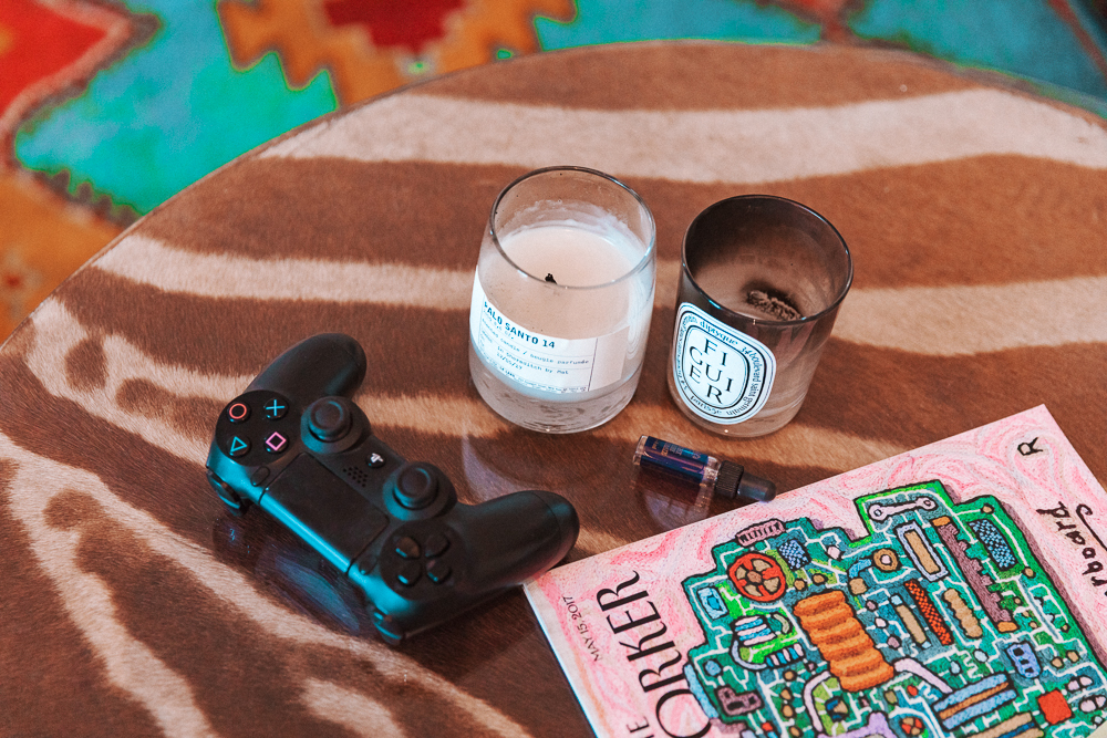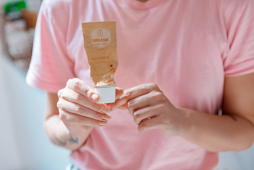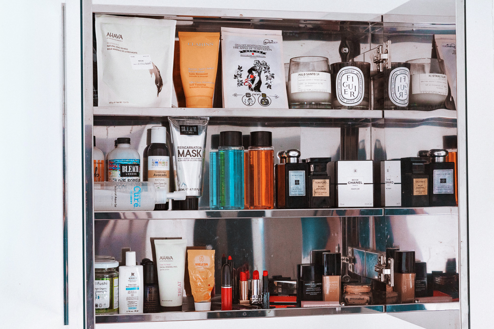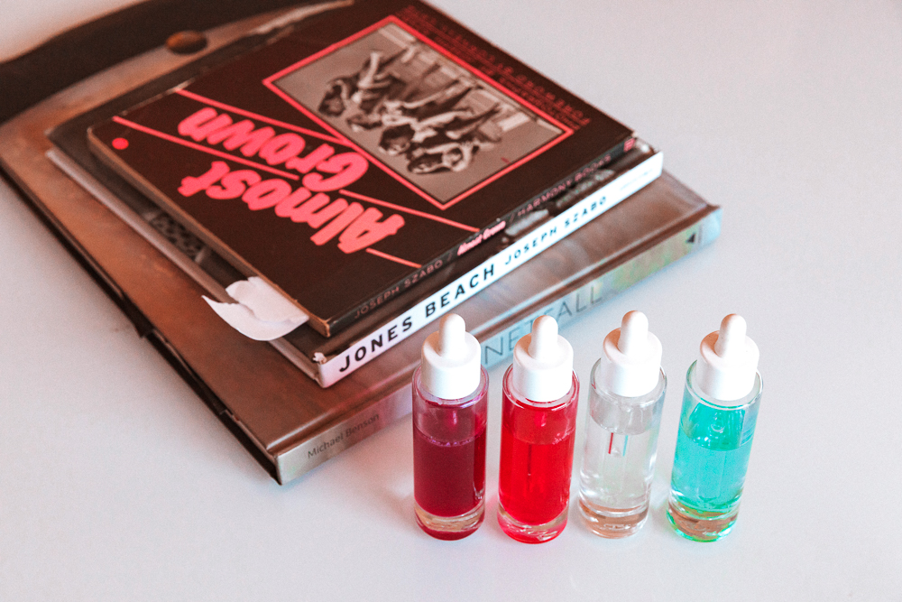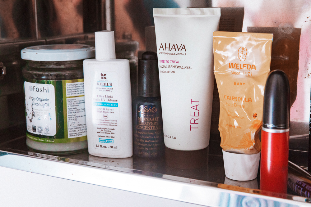 Every morning and evening, I use Bioderma as a cleanser. I don’t really use a cleanser, unless I’ve got makeup on. This Ahava Facial Renewal Peel is a new thing that I’ve used a couple times. Then I use Skinceuticals CE Ferulic Serum on my whole face. I put one or two drops. I use it twice or three times a week—it tans you a bit, I think. Then, I use Weleda Calendula Face Cream, which is a baby face cream. It’s lightweight and it’s not cloggy. I’ve really struggled with moisturizers because I have acne. You can’t tell right now because I have an amazing facialist, Teresa Tarmey. She’s really good. I’m quite terrified to try anything else. This is an exfoliator from Japan, Cure Natural Aqua Gel. It’s got peroxide in it, which is really great if you’ve got problem skin like mine. I use it once a month. If I’m not at home and I’ve forgotten everything, I’ll use coconut oil to cleanse, moisturize, take my makeup off and I put it on my scalp. At nighttime, I use Kiehl’s Midnight Recovery Oil.