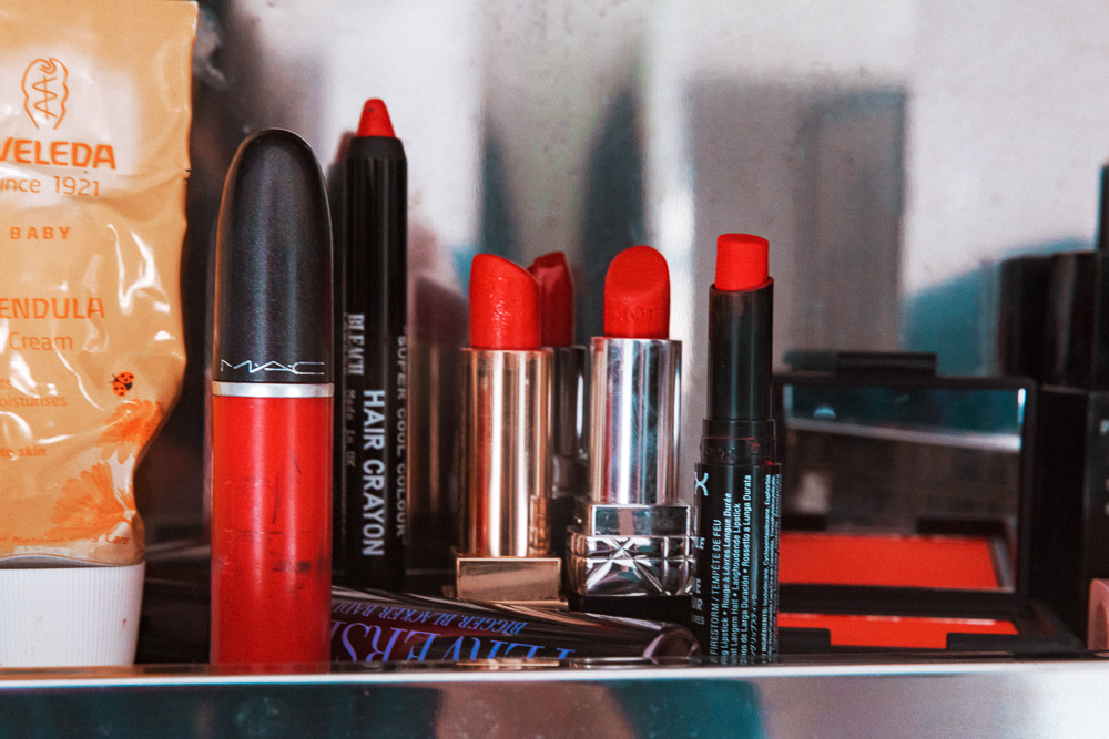 My mascara changes quite a bit. I normally use the Diorshow Mascara and I’ve got this mascara that I borrowed from a friend at a wedding, Urban Decay Perversion Mascara. And I love to use loads of red lipstick. This MAC Fashion Legacy Retro Matte Liquid Lipstick is my favorite actually. I like bright red. First, I use the Dior Addict Lip Sugar Scrub if I have scrubby lips, and then I’ll use their gloss. Sometimes I use lipstick on my eyes–quite often actually–if I’m going out and doing something more. I like warm colors on my eyes.