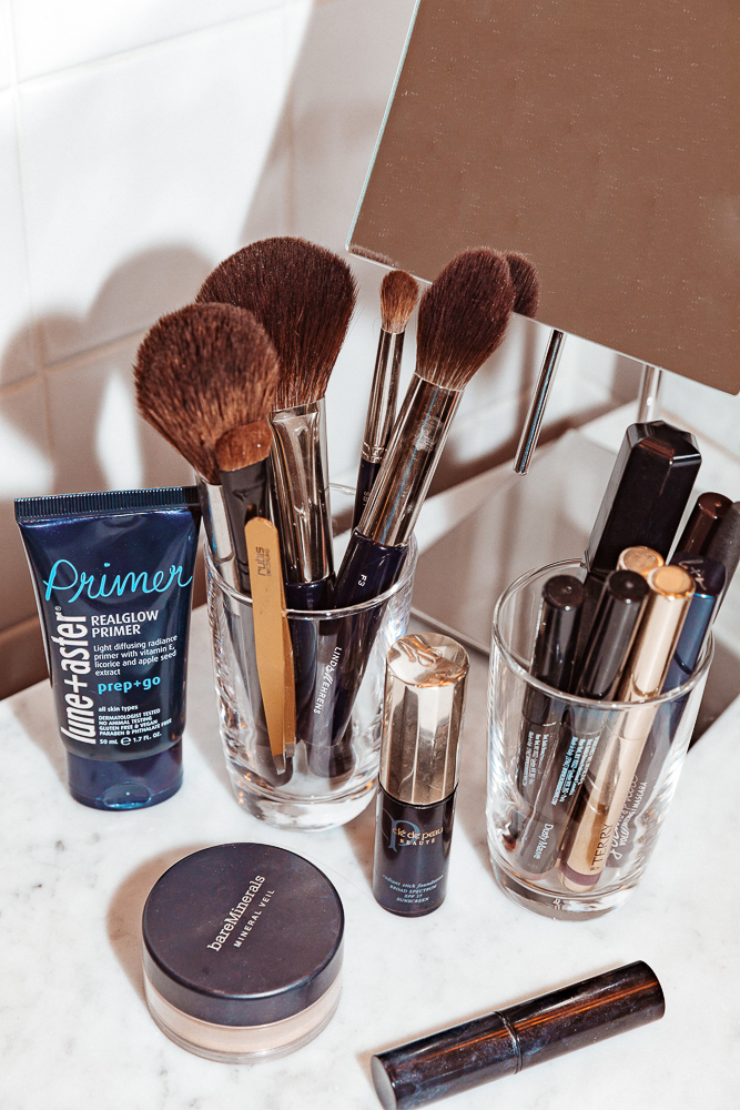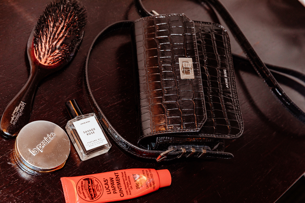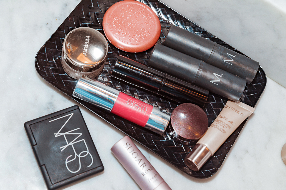 On eyes, I love these thick shadow sticks that almost every brand makes now. I line the whole eye almost. Sometimes I smoke it out, but never with black. Back in the day I used to do it with black, but now I feel like it’s too much. I use a different tone, like a grey or bronze-y one. I have the By Terry ones, the Ombre Blackstar in 4 Bronze Moon, and 9 Velvet Orchid. I also like the Laura Mercier Caviar Stick in Cocoa and the Bobbi Brown Longwear Shadow Stick in Dusty Mauve. They all have this earthy tone to them, which I personally prefer. I normally take Nars Portobello and mix it with one of the shadow sticks and just blend it across my lid. I love using my hands, because it’s a little messier and sexier, not too perfect. For mascara, I love the Chanel one, but I just ran out. Now I use the Marc Jacobs Velvet Noir Mascara Volume. Sometimes I also use the Lune+Aster one. For lips, I use Sugar Rose from Fresh. I don’t feel comfortable in a red lip so I’d rather do eyes and a natural lip, like a pink. Sometimes I just use the cream blush on my lips.