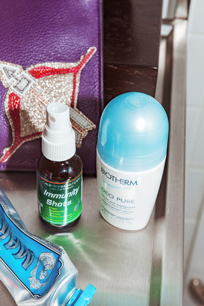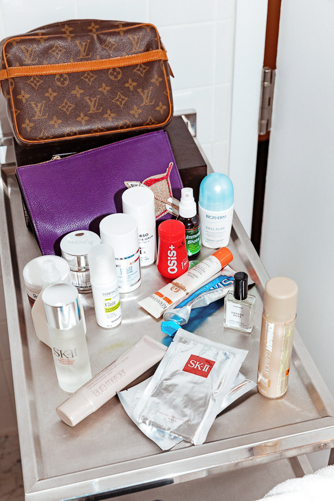 To get ready, I maybe have a glass of wine, put on some music first. Step one to getting ready is a shower, and I like to put on a nice body lotion which I never have time to do during the day. For body lotion, do you know Weleda? I have the rose lotion from them that I love. Then I put on my Savage Rose after that. I like a perfume oil because I can carry it around with me. I clean my face and I use the SKII Facial Treatment Essence, or the Paula’s Choice one—I love their stuff too. I use the Skin Perfecting Liquid because it really smooths you out. Then I use La Prairie Swiss Ice Crystal Eye Cream, that’s a good one. And this one I buy in Paris, The Dermaceutic Laboratoire K-Ceutic. It’s one of those secret products that makeup artists and models use. At the pharmacies, you have to ask inside if they have it in the back, so it’s kind of secret. It gives just a little bit of glow. So days when I don’t wear makeup, I just put this on. Sometimes after I travel, especially when I go to Europe and feel horrible from jet lag, I do a mask. It just wakes you up. I use the SK-II Facial Treatment Masks. There’s a lot of great ones, I just happen to have these on me. This Jurlique Rosewater Balancing Mist is good as an anytime moisture.