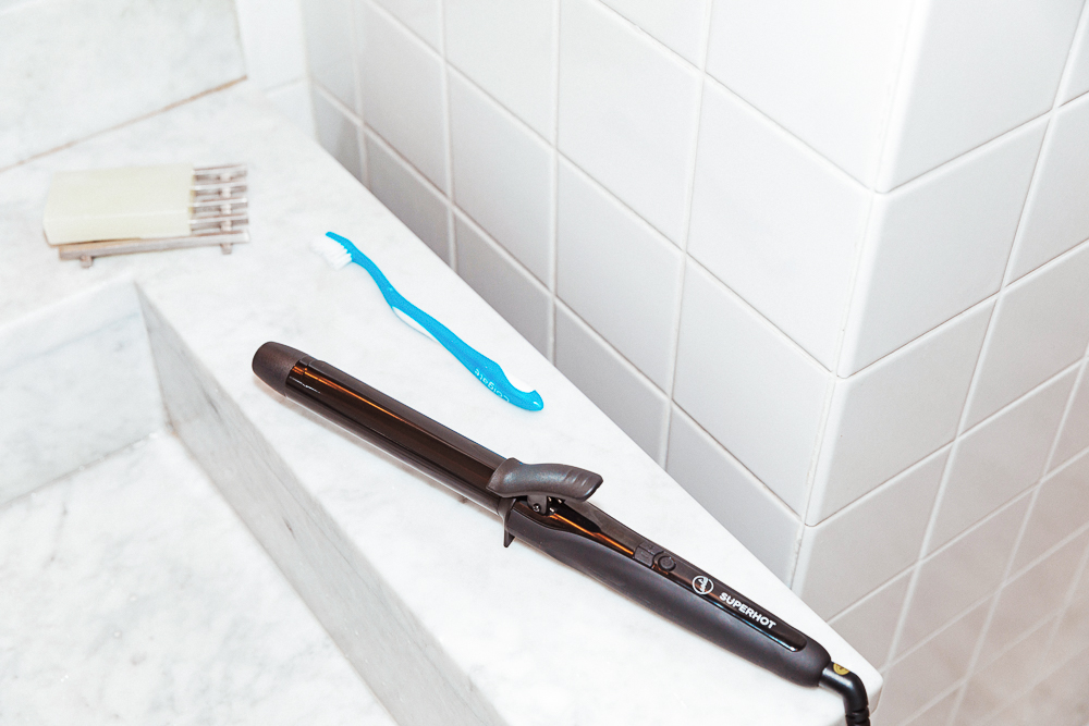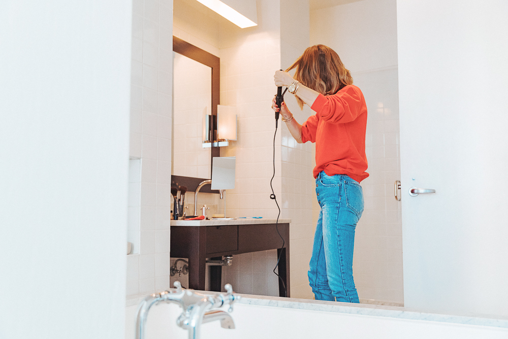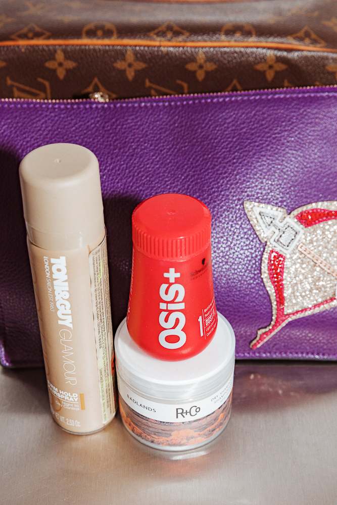 I don’t wash my hair everyday—twice a week, maximum. I have really fine hair, so dry shampoo is the key. I let it air dry and then I curl it with a one-inch barrel... I just do a few strands. My curling iron is Solia. For hair, I seriously don’t care about products. Is that bad? I have the Dry Shampoo Paste from R+CO - it’s good, but if you take too much, it gets weird. My favorite is BlowPro Faux Dry Dry Shampoo. I used to find it in New York, but can’t find it here. That’s my favorite.