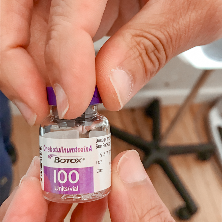 A few weeks later, I sat upright against the cushions of Dr. Charles’s lab recliner, with ice packs squeezed underneath my arms. The cool compress numbed my shallow pits and I tried to appear just as chill, concealing a slight case of nerves. I instead focused on all the silk separates I could soon wear with abandon and then watched as Dr. Charles and his medical assistant prepared the Botox, its powdery form first submerged in saline to dilute its consistency. Filling 10 syringes with one CC of Botox each, Dr. Charles explained he would be pricking each side 10 times.