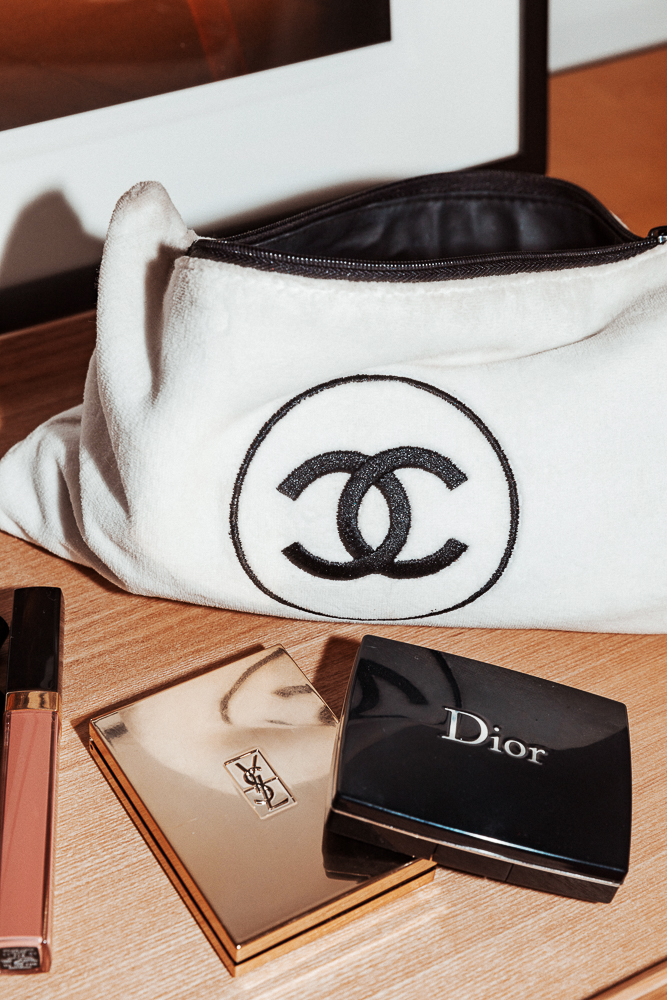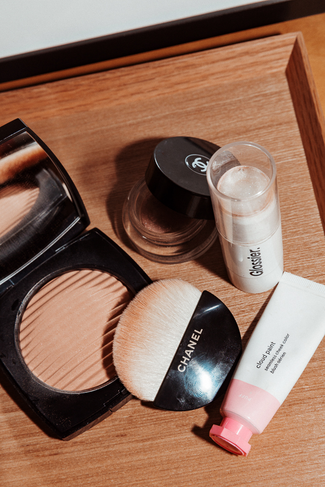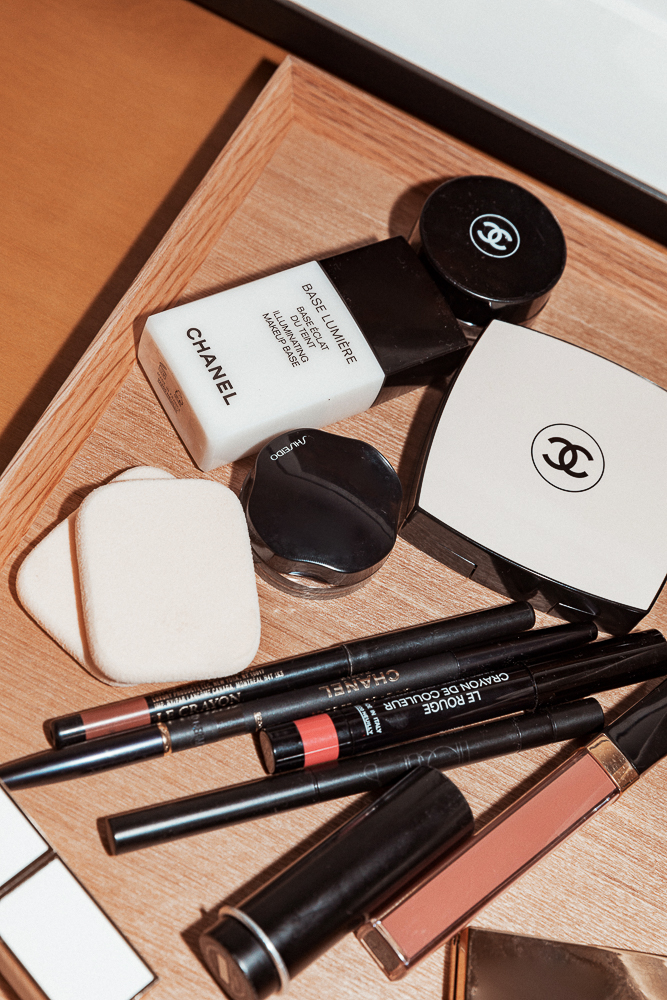 For my makeup...my new thing is that I just discovered bases, or primers. They’re nice, they help keep your makeup on longer. The one I like is Base Lumière by Chanel. It kind of has a little shimmer, so it doesn’t make you dewy really, but it looks extra nice. And then Delilah Parillo showed me this Illuminating Primer by Tom Ford. It’s a little pearlier than the Chanel, so I put a bit on my cheekbones and finish off with highlighter. I always hated highlighters, but I have so many now. This new one, Chanel Les Beiges in Medium Light—it’s just…I don’t know, fresh. And it smells so good. It’s pretty matte, and the color is a subtle gold, so you can put it on top of anything. I’m very obsessed with Chanel. I think this is from their new beige collection—I love beige. As long as it’s Chanel and it’s beige I’m buying it.