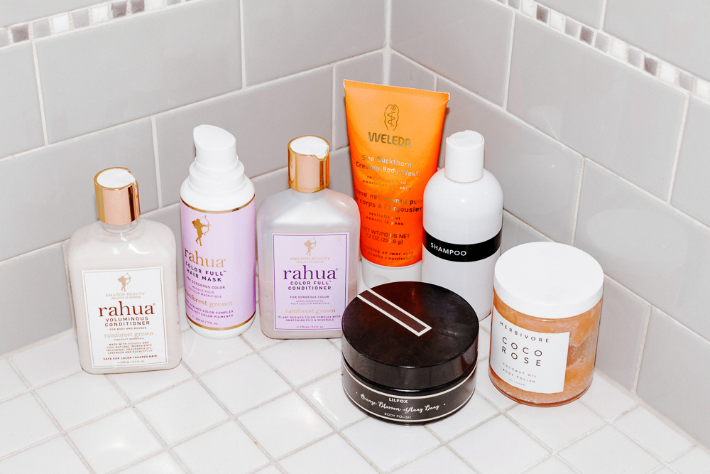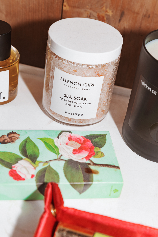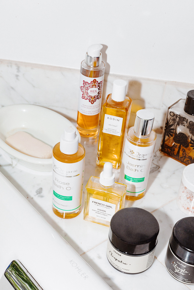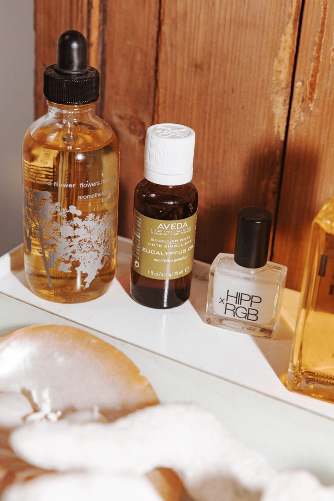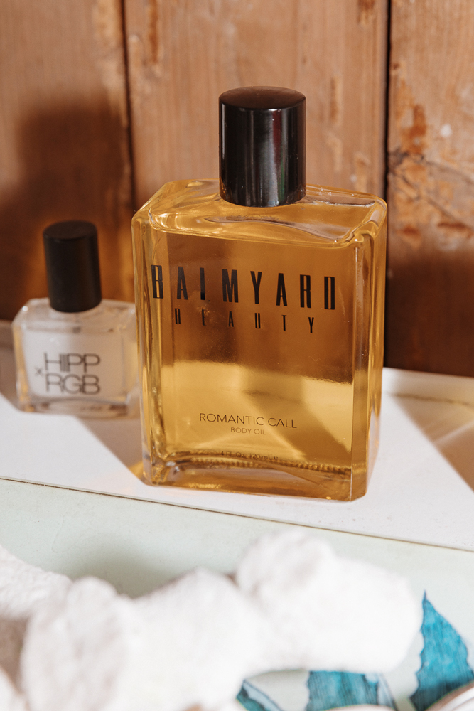 When I'm not self-tanning, I really don't like putting lotion on my body because I'm always cold. So I love an oil bath instead. My favorite one to use right now is Olverum Bath Oil—it smells the most sophisticated, like fancy Parisian ladies. Or I use something like the Beautycounter Sugar Body Scrub in Lemongrass, which leaves you super moisturized after you use it. I would use the Balmyard Beauty Romantic Call Body Oil in the bath, but I love the scent so much, it's more like a perfume to me. It’s sexier. And the whole idea of the perfume is to be sexy.