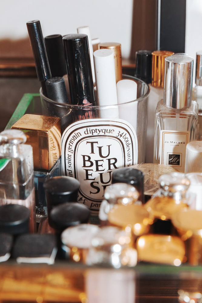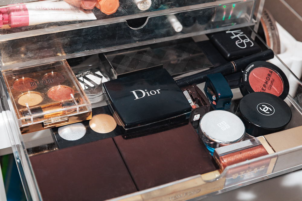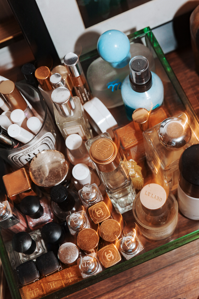 From there, it’s all about a little contour. Day to day, I use Chanel Soleil de Tan right underneath my cheekbones, on the sides of my nose, and then on the sides of my forehead. If I’m going out or trying to look sexy, I use the Charlotte Tilbury Filmstar Bronze and Glow to look more defined. I put it in the same places with a flat brush, but I only use the contour color because I highlight with Haloscope. Some call me Haloscope queen. Just kidding, no one calls me that. Mostly I use Moonstone as a highlight on the half-halo and bridge of my nose, with Topaz underneath where I do my bronzer and on my cheekbones. Blush-wise, I use the Chanel Les Beiges Healthy Glow Sheer Colour Stick in No. 20 every day. On my eyes—everyone knows this already—but I love the Sisley Phyto-Lip Twist in Nude. It has this shimmery, purple-ish tint, sort of like a natural eyelid. I will also use Milani Fierce Foil Eyeshine in Naples for a pink lid. A red eye is really me right now, so the Stila Magnificent Metals in Rose Gold Retro or Givenchy Rosy Glow Lip and Cheek Balm are my favorites for that. My mascara is Chanel Le Volume or Maybelline. Honestly, I feel like drugstore mascaras are fine, but when I go buy Chanel Le Volume it’s kind of like a treat, like a Cheat Day.